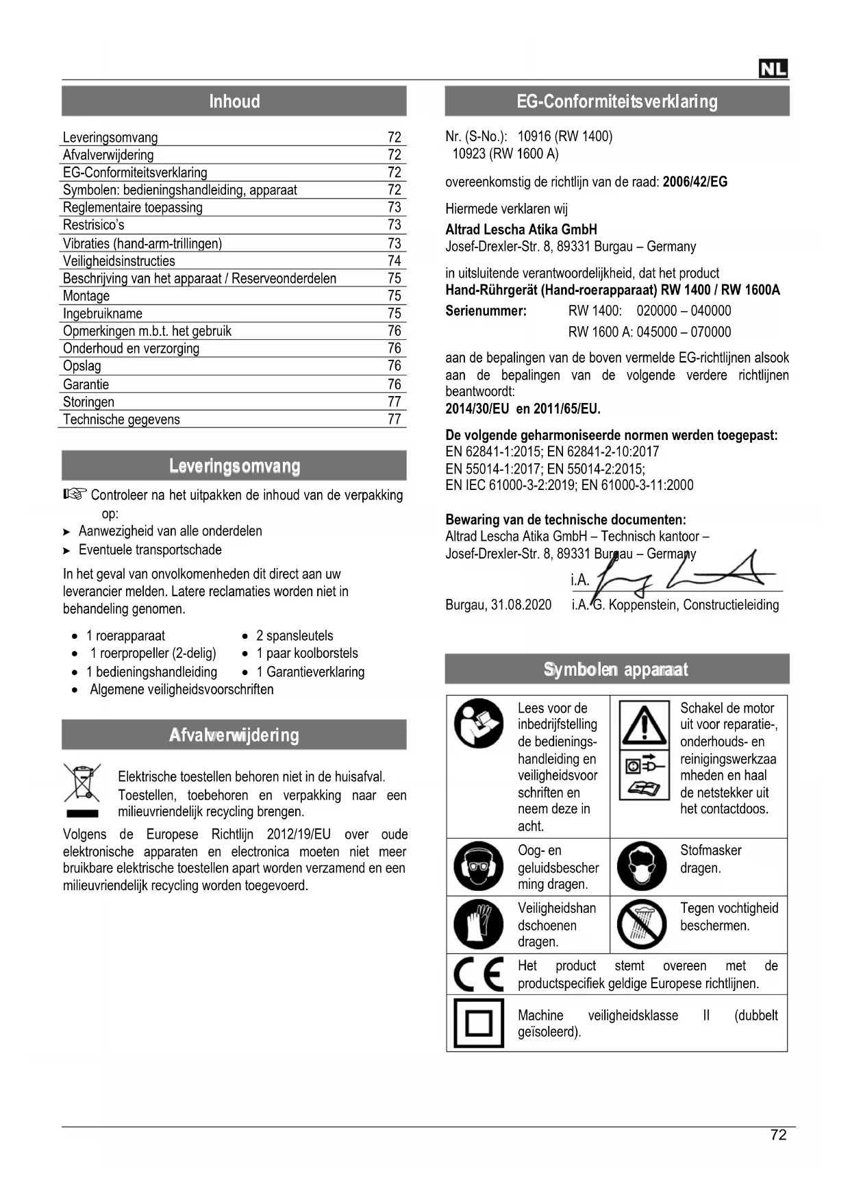 Nr. (S-No.): 10916 (RW 1400) 10923 (RW 1600 A) overeenkomstig de richtlijn van de raad: 2006/42/EG Hiermede verklaren wij Altrad Lescha Atika GmbH Josef-Drexler-Str. 8, 89331 Burgau – Germany in uitsluitende verantwoordelijkheid, dat het product Hand-Rührgerät (Hand-roerapparaat) RW 1400 / RW 1600A Serienummer: RW 1400: 020000 – 040000 RW 1600 A: 045000 – 070000 aan de bepalingen van de boven vermelde EG-richtlijnen alsook aan de bepalingen van de volgende verdere richtlijnen beantwoordt: 2014/30/EU en 2011/65/EU. De volgende geharmoniseerde normen werden toegepast: EN 62841-1:2015; EN 62841-2-10:2017 EN 55014-1:2017; EN 55014-2:2015; EN IEC 61000-3-2:2019; EN 61000-3-11:2000