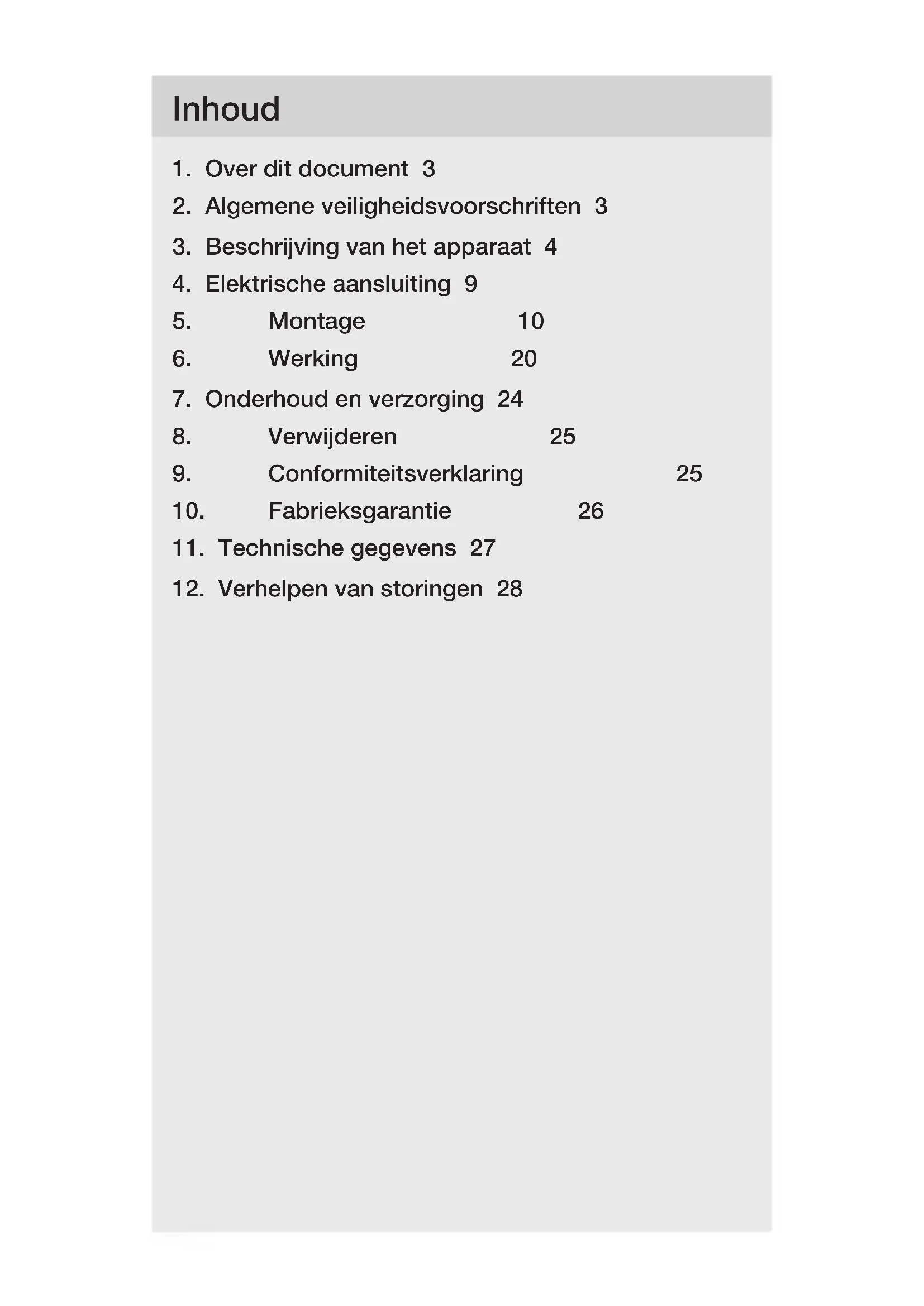 - Reinig het apparaat met een licht bevochtigde doek zonder reinigingsmiddel. Belangrijk: de regelaar kan niet worden vervangen.– 25 – Inhoud