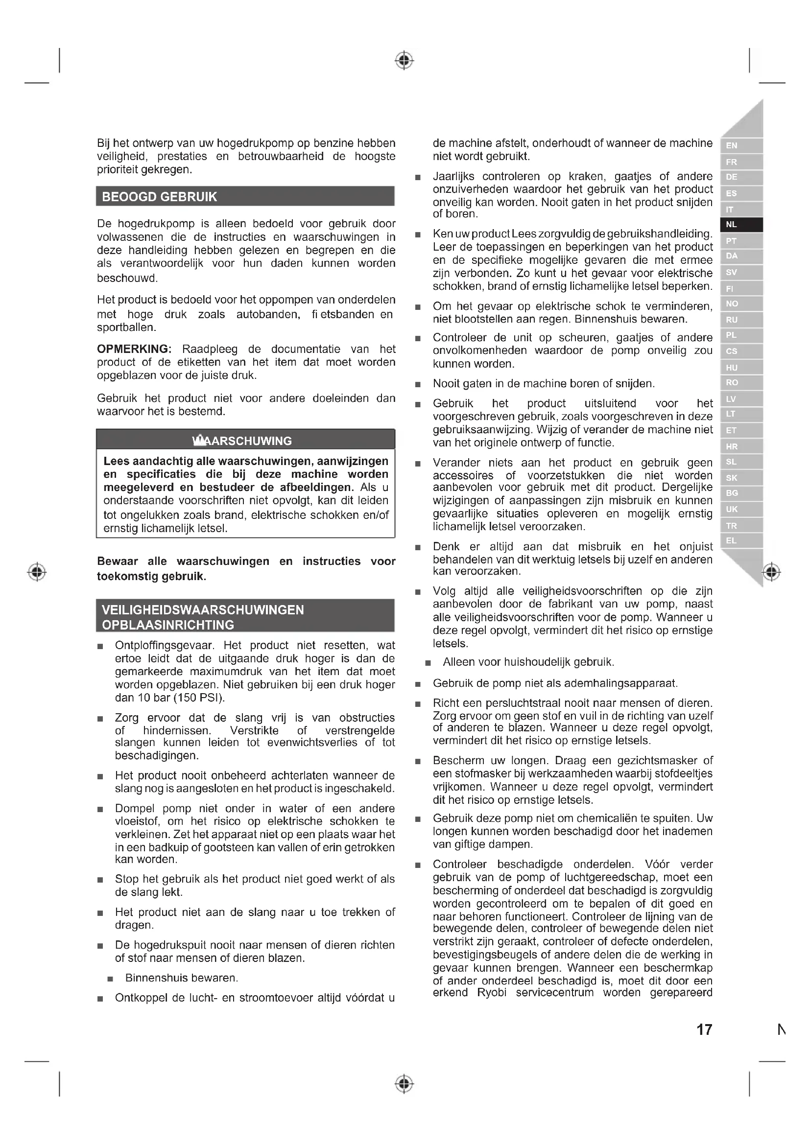 Bij het ontwerp van uw hogedrukpomp op benzine hebben veiligheid, prestaties en betrouwbaarheid de hoogste prioriteit gekregen. BEOOGD GEBRUIK De hogedrukpomp is alleen bedoeld voor gebruik door volwassenen die de instructies en waarschuwingen in deze handleiding hebben gelezen en begrepen en die als verantwoordelijk voor hun daden kunnen worden beschouwd. Het product is bedoeld voor het oppompen van onderdelen met hoge druk zoals autobanden, fi etsbanden en sportballen. OPMERKING: Raadpleeg de documentatie van het product of de etiketten van het item dat moet worden opgeblazen voor de juiste druk. Gebruik het product niet voor andere doeleinden dan waarvoor het is bestemd. WAARSCHUWING Lees aandachtig alle waarschuwingen, aanwijzingen en specificaties die bij deze machine worden meegeleverd en bestudeer de afbeeldingen. Als u onderstaande voorschriften niet opvolgt, kan dit leiden tot ongelukken zoals brand, elektrische schokken en/of ernstig lichamelijk letsel. Bewaar alle waarschuwingen en instructies voor toekomstig gebruik. VEILIGHEIDSWAARSCHUWINGEN OPBLAASINRICHTING ■ Ontploffingsgevaar. Het product niet resetten, wat ertoe leidt dat de uitgaande druk hoger is dan de gemarkeerde maximumdruk van het item dat moet worden opgeblazen. Niet gebruiken bij een druk hoger dan 10 bar (150 PSI). ■ Zorg ervoor dat de slang vrij is van obstructies of hindernissen. Verstrikte of verstrengelde slangen kunnen leiden tot evenwichtsverlies of tot beschadigingen. ■ Het product nooit onbeheerd achterlaten wanneer de slang nog is aangesloten en het product is ingeschakeld. ■ Dompel pomp niet onder in water of een andere vloeistof, om het risico op elektrische schokken te verkleinen. Zet het apparaat niet op een plaats waar het in een badkuip of gootsteen kan vallen of erin getrokken kan worden. ■ Stop het gebruik als het product niet goed werkt of als de slang lekt. ■ Het product niet aan de slang naar u toe trekken of dragen. ■ De hogedrukspuit nooit naar mensen of dieren richten of stof naar mensen of dieren blazen. ■ Binnenshuis bewaren. ■ Ontkoppel de lucht- en stroomtoevoer altijd vóórdat u de machine afstelt, onderhoudt of wanneer de machine niet wordt gebruikt. ■ Jaarlijks controleren op kraken, gaatjes of andere onzuiverheden waardoor het gebruik van het product onveilig kan worden. Nooit gaten in het product snijden of boren. ■ Ken uw product Lees zorgvuldig de gebruikshandleiding. Leer de toepassingen en beperkingen van het product en de specifieke mogelijke gevaren die met ermee zijn verbonden. Zo kunt u het gevaar voor elektrische schokken, brand of ernstig lichamelijke letsel beperken. ■ Om het gevaar op elektrische schok te verminderen, niet blootstellen aan regen. Binnenshuis bewaren. ■ Controleer de unit op scheuren, gaatjes of andere onvolkomenheden waardoor de pomp onveilig zou kunnen worden. ■ Nooit gaten in de machine boren of snijden. ■ Gebruik het product uitsluitend voor het voorgeschreven gebruik, zoals voorgeschreven in deze gebruiksaanwijzing. Wijzig of verander de machine niet van het originele ontwerp of functie. ■ Verander niets aan het product en gebruik geen accessoires of voorzetstukken die niet worden aanbevolen voor gebruik met dit product. Dergelijke wijzigingen of aanpassingen zijn misbruik en kunnen gevaarlijke situaties opleveren en mogelijk ernstig lichamelijk letsel veroorzaken. ■ Denk er altijd aan dat misbruik en het onjuist behandelen van dit werktuig letsels bij uzelf en anderen kan veroorzaken. ■ Volg altijd alle veiligheidsvoorschriften op die zijn aanbevolen door de fabrikant van uw pomp, naast alle veiligheidsvoorschriften voor de pomp. Wanneer u deze regel opvolgt, vermindert dit het risico op ernstige letsels. ■ Alleen voor huishoudelijk gebruik. ■ Gebruik de pomp niet als ademhalingsapparaat. ■ Richt een persluchtstraal nooit naar mensen of dieren. Zorg ervoor om geen stof en vuil in de richting van uzelf of anderen te blazen. Wanneer u deze regel opvolgt, vermindert dit het risico op ernstige letsels. ■ Bescherm uw longen. Draag een gezichtsmasker of een stofmasker bij werkzaamheden waarbij stofdeeltjes vrijkomen. Wanneer u deze regel opvolgt, vermindert dit het risico op ernstige letsels. ■ Gebruik deze pomp niet om chemicaliën te spuiten. Uw longen kunnen worden beschadigd door het inademen van giftige dampen. ■ Controleer beschadigde onderdelen. Vóór verder gebruik van de pomp of luchtgereedschap, moet een bescherming of onderdeel dat beschadigd is zorgvuldig worden gecontroleerd om te bepalen of dit goed en naar behoren functioneert. Controleer de lijning van de bewegende delen, controleer of bewegende delen niet verstrikt zijn geraakt, controleer of defecte onderdelen, bevestigingsbeugels of andere delen die de werking in gevaar kunnen brengen. Wanneer een beschermkap of ander onderdeel beschadigd is, moet dit door een erkend Ryobi servicecentrum worden gerepareerd18 | Nederlands of vervangen. Zo kunt u het gevaar voor elektrische schokken, brand of ernstig lichamelijke letsel beperken. ■ Inspecteer regelmatig de gereedschapsnoeren en laat deze, indien beschadigd, door een geautoriseerde onderhoudsdienst repareren. Zorg dat u altijd weet waar het netsnoer zich precies bevindt. Zo beperkt u de kans op elektrische schokken. ■ Ontploffingsgevaar. Observeer de voorwerpen zorgvuldig tijdens het oppompen. ■ Gebruik regelmatig een betrouwbare manometer tijdens het oppompen om het risico op overmatig oppompen te verminderen. De manometer op de pomp is alleen ter referentie en is daarom niet geschikt voor exacte waarden. ■ Laat de pomp gedurende vijf (5) minuten afkoelen na elke vijf (5) minuten continu gebruik. Blokkeer nooit de opblaas- of uitblaas openingen tijdens het gebruik. ■ Bewaar deze instructies. Raadpleeg ze regelmatig en gebruik dit om anderen doe dit werktuig mogelijks gebruiken, te instrueren. Als u dit werktuig aan iemand uitleent, leen hem dan deze instructies ook uit. ■ To