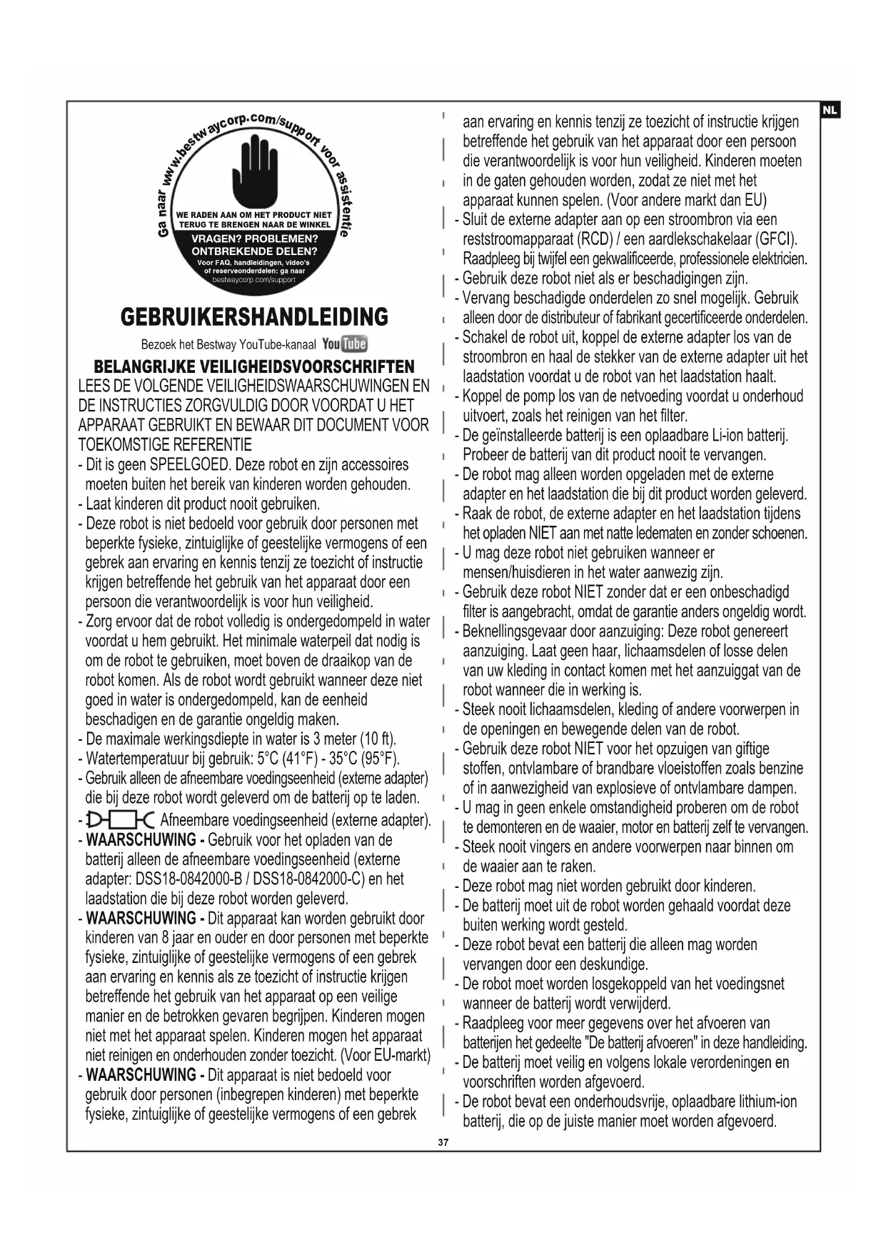 Gebruik alleen de afneembare voedingseenheid (externe adapter) die bij deze robot wordt geleverd om de batterij op te laden. - Afneembare voedingseenheid (externe adapter). - WAARSCHUWING - Gebruik voor het opladen van de batterij alleen de afneembare voedingseenheid (externe adapter: DSS18-0842000-B / DSS18-0842000-C) en het laadstation die bij deze robot worden geleverd. - WAARSCHUWING - Dit apparaat kan worden gebruikt door kinderen van 8 jaar en ouder en door personen met beperkte fysieke, zintuiglijke of geestelijke vermogens of een gebrek aan ervaring en kennis als ze toezicht of instructie krijgen betreffende het gebruik van het apparaat op een veilige manier en de betrokken gevaren begrijpen. Kinderen mogen niet met het apparaat spelen. Kinderen mogen het apparaat niet reinigen en onderhouden zonder toezicht. (Voor EU-markt) - WAARSCHUWING - Dit apparaat is niet bedoeld voor gebruik door personen (inbegrepen kinderen) met beperkte fysieke, zintuiglijke of geestelijke vermogens of een gebrek aan ervaring en kennis tenzij ze toezicht of instructie krijgen betreffende het gebruik van het apparaat door een persoon die verantwoordelijk is voor hun veiligheid. Kinderen moeten in de gaten gehouden worden, zodat ze niet met het apparaat kunnen spelen. (Voor andere markt dan EU) - Sluit de externe adapter aan op een stroombron via een reststroomapparaat (RCD) / een aardlekschakelaar (GFCI). Raadpleeg bij twijfel een gekwalificeerde, professionele elektricien. - Gebruik deze robot niet als er beschadigingen zijn. - Vervang beschadigde onderdelen zo snel mogelijk. Gebruik alleen door de distributeur of fabrikant gecertificeerde onderdelen. - Schakel de robot uit, koppel de externe adapter los van de stroombron en haal de stekker van de externe adapter uit het laadstation voordat u de robot van het laadstation haalt. - Koppel de pomp los van de netvoeding voordat u onderhoud uitvoert, zoals het reinigen van het filter. - De geïnstalleerde batterij is een oplaadbare Li-ion batterij. Probeer de batterij van dit product nooit te vervangen. - De robot mag alleen worden opgeladen met de externe adapter en het laadstation die bij dit product worden geleverd. - Raak de robot, de externe adapter en het laadstation tijdens het opladen NIET aan met natte ledematen en zonder schoenen. - U mag deze robot niet gebruiken wanneer er mensen/huisdieren in het water aanwezig zijn. - Gebruik deze robot NIET zonder dat er een onbeschadigd filter is aangebracht, omdat de garantie anders ongeldig wordt. - Beknellingsgevaar door aanzuiging: Deze robot genereert aanzuiging. Laat geen haar, lichaamsdelen of losse delen van uw kleding in contact komen met het aanzuiggat van de robot wanneer die in werking is. - Steek nooit lichaamsdelen, kleding of andere voorwerpen in de openingen en bewegende delen van de robot. - Gebruik deze robot NIET voor het opzuigen van giftige stoffen, ontvlambare of brandbare vloeistoffen zoals benzine of in aanwezigheid van explosieve of ontvlambare dampen. - U mag in geen enkele omstandigheid proberen om de robot te demonteren en de waaier, motor en batterij zelf te vervangen. - Steek nooit vingers en andere voorwerpen naar binnen om de waaier aan te raken. - Deze robot mag niet worden gebruikt door kinderen. - De batterij moet uit de robot worden gehaald voordat deze buiten werking wordt gesteld. - Deze robot bevat een batterij die alleen mag worden vervangen door een deskundige. - De robot moet worden losgekoppeld van het voedingsnet wanneer de batterij wordt verwijderd. - Raadpleeg voor meer gegevens over het afvoeren van batterijen het gedeelte "De batterij afvoeren" in deze handleiding. - De batterij moet veilig en volgens lokale verordeningen en voorschriften worden afgevoerd. - De robot bevat een onderhoudsvrije, oplaadbare lithium-ion batterij, die op de juiste manier moet worden afgevoerd. Recycling is vereist; neem contact op met uw plaatselijke overheid voor meer informatie. - Externe adapter en laadstation: