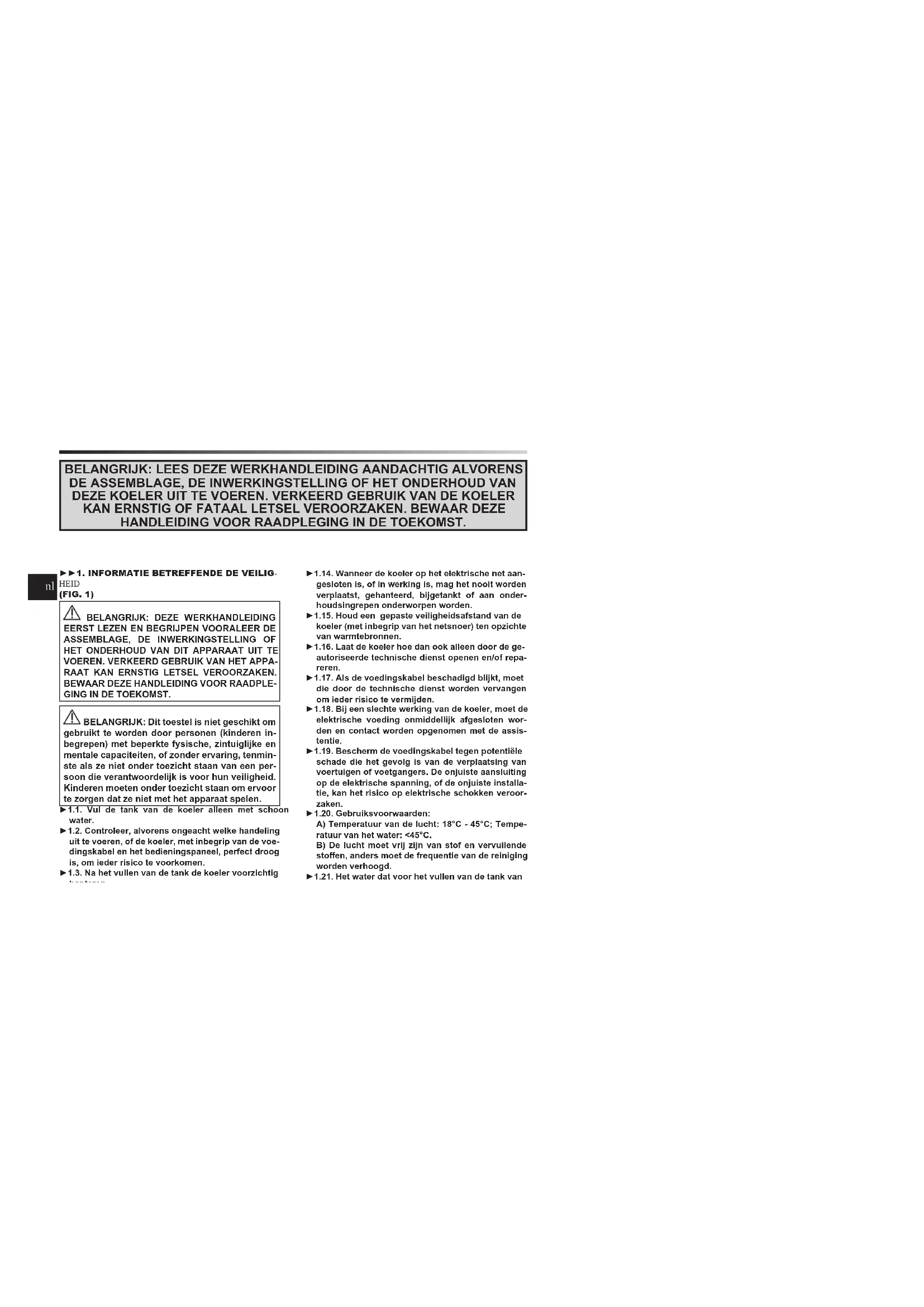 GING IN DE TOEKOMST. BELANGRIJK: Dit toestel is niet geschikt om gebruikt te worden door personen (kinderen in- begrepen) met beperkte fysische, zintuiglijke en mentale capaciteiten, of zonder ervaring, tenmin- ste als ze niet onder toezicht staan van een per- soon die verantwoordelijk is voor hun veiligheid. Kinderen moeten onder toezicht staan om ervoor te zorgen dat ze niet met het apparaat spelen. ►1.1. Vul de tank van de koeler alleen met schoon water. ►1.2. Controleer, alvorens ongeacht welke handeling uit te voeren, of de koeler, met inbegrip van de voe- dingskabel en het bedieningspaneel, perfect droog is, om ieder risico te voorkomen. ►1.3. Na het vullen van de tank de koeler voorzichtig hanteren. ►1.4. Tijdens het gebruik van de koeler dient u zich te houden aan alle plaatselijke verordeningen en aan de geldende wetgeving. ►1.5. Om zich tegen elektrische schokken te bescher- men, dient u de koeler droog te houden. Werk niet met natte handen. ►1.6. Gebruik het alleen in goed geventileerde en per- fect droge ruimtes. ►1.7. Gebruik het alleen in overdekte structuren. ►1.8. Voorzie de koeler alleen van de spanning en de frequentie die op het gegevensplaatje staan. ►1.9. Dek de koeler niet af met papier, karton, plas- tic, metalen bladen of met ieder ander ontvlambaar materiaal, tijdens het gebruik, om ieder risico te voorkomen. ►1.10. De koeler mag alleen gebruikt worden op een stabiel en genivelleerd oppervlak zodat ieder risico vermeden wordt. ►1.11. Haal de stekker van de koeler uit het stopcon- tact wanneer u hem niet gebruikt. ►1.12. De luchtinlaten of de luchtuitlaat van de koeler nooit blokkeren. ►1.13. De minimum veiligheidsafstand, die aanbe- volen wordt, tussen de koeler en muren of andere voorwerpen, is 0,5 m. ►1.14. Wanneer de koeler op het elektrische net aan- gesloten is, of in werking is, mag het nooit worden verplaatst, gehanteerd, bijgetankt of aan onder- houdsingrepen onderworpen worden. ►1.15. Houd een gepaste veiligheidsafstand van de koeler (met inbegrip van het netsnoer) ten opzichte van warmtebronnen. ►1.16. Laat de koeler hoe dan ook alleen door de ge- autoriseerde technische dienst openen en/of repa- reren. ►1.17. Als de voedingskabel beschadigd blijkt, moet die door de technische dienst worden vervangen om ieder risico te vermijden. ►1.18. Bij een slechte werking van de koeler, moet de elektrische voeding onmiddellijk afgesloten wor- den en contact worden opgenomen met de assis- tentie. ►1.19. Bescherm de voedingskabel tegen potentiële schade die het gevolg is van de verplaatsing van voertuigen of voetgangers. De onjuiste aansluiting op de elektrische spanning, of de onjuiste installa- tie, kan het risico op elektrische schokken veroor- zaken. ►1.20. Gebruiksvoorwaarden: A) Temperatuur van de lucht: 18°C - 45°C; Tempe- ratuur van het water: <45°C. B) De lucht moet vrij zijn van stof en vervuilende stoen, anders moet de frequentie van de reiniging worden verhoogd. ►1.21. Het water dat voor het vullen van de tank van de koeler gebruikt wordt, moet afkomstig zijn van een waterleiding. Als het niet mogelijk is van een waterleiding gebruik te maken, moet het ingevoer- de water onderworpen worden aan een waterzui- veringsbehandeling volgens de Europese richtlijn 98/83/EG. -Er wordt aanbevolen water met een hardheid lager dan 15°f te gebruiken. -De tank van de koeler moet regelmatig, al naarge- lang het gebruik, geleegd en ontsmet worden. -De oppervlakken van de verdampingspanelen moeten regelmatig, al naargelang het gebruik, ge- inspecteerd en ontsmet worden. -Voor de ontsmettingswerkzaamheden moeten bio- ciden gebruikt worden conform de Europese veror- dening 582/2012. ►►2. UITPAKKEN ►2.1. Haal alle verpakkingsmateriaal weg, gebruikt om de koeler te verpakken en te verzenden, en verwijder dit volgens de geldende normen. ►2.2. Controleer of er tijdens het transport geen schade is opgetreden. Als de koeler beschadigd is, moet u on-