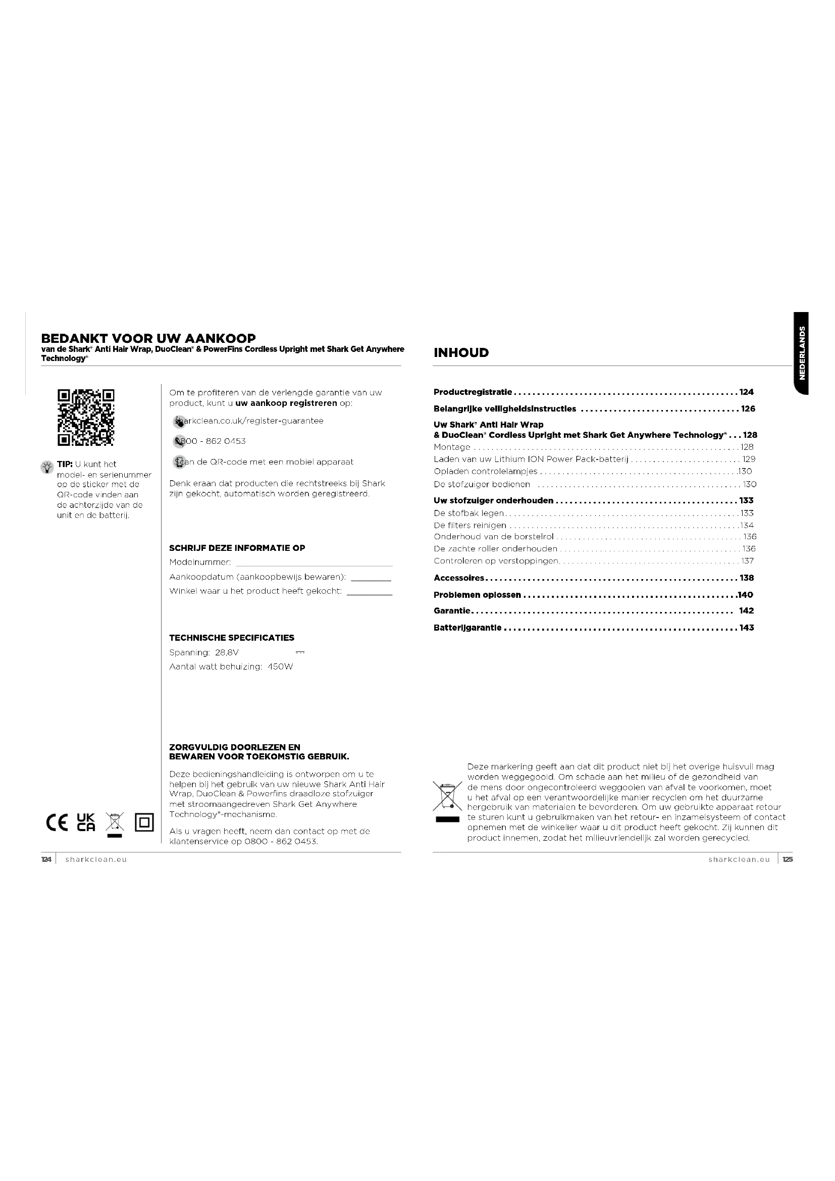 BEWAREN VOOR TOEKOMSTIG GEBRUIK. Deze bedieningshandleiding is ontworpen om u te helpen bij het gebruik van uw nieuwe Shark Anti Hair Wrap, DuoClean & Powerfins draadloze stofzuiger met stroomaangedreven Shark Get Anywhere Technology®-mechanisme. Als u vragen heeft, neem dan contact op met de klantenservice op 0800 - 862 0453. TECHNISCHE SPECIFICATIES Spanning: 28,8V Aantal watt behuizing: 450W TIP: U kunt het model- en serienummer op de sticker met de QR-code vinden aan deachterzijde van de unit en de batterij.