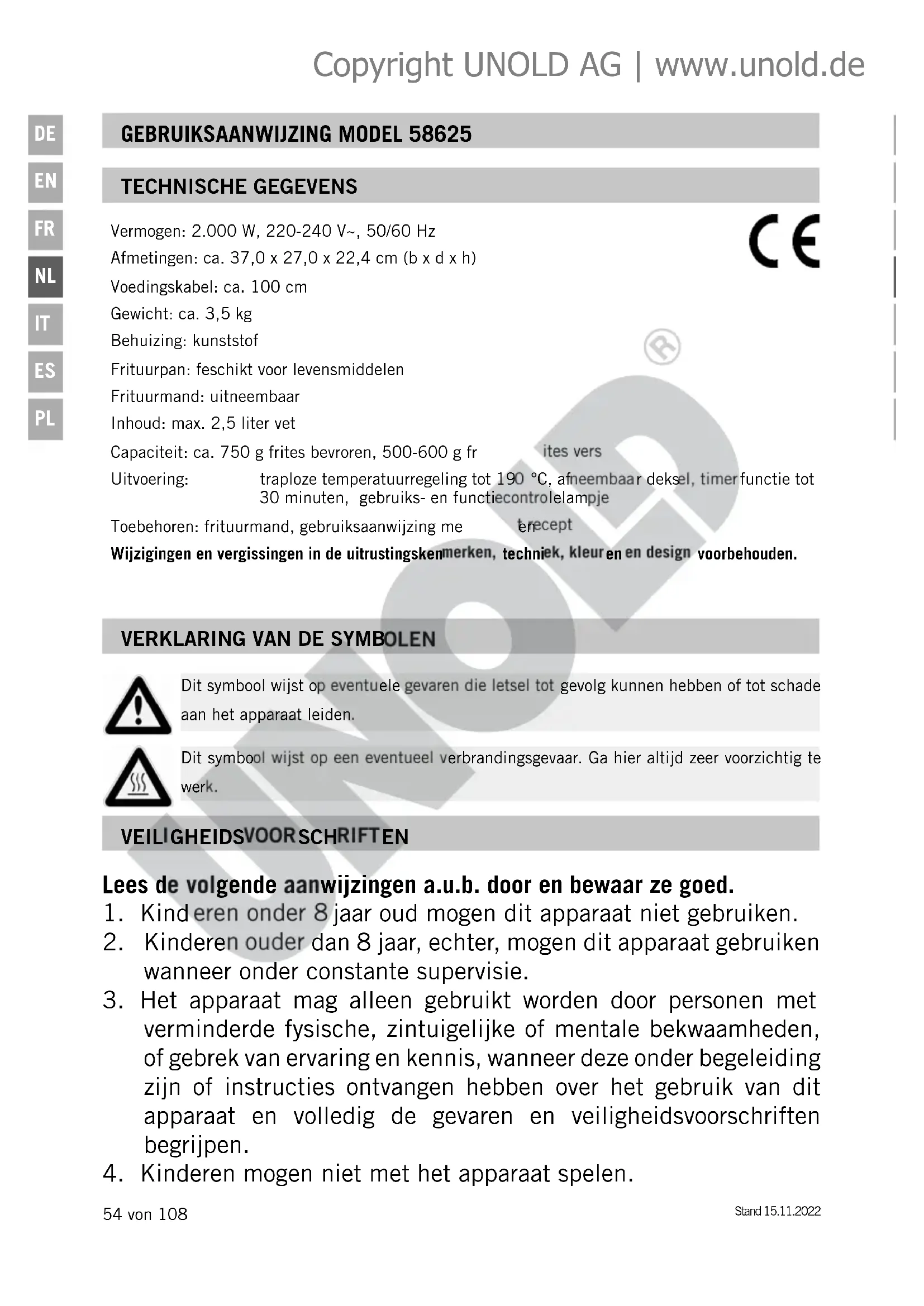 slijtage en beschadigingen. Stuur het apparaat of het snoer in geval van beschadigingen van het snoer of andere onderdelen a.u.b. voor controle en/of reparatie aan onze klantenservice. Ondeskundig uitgevoerde reparaties kunnen aanzienlijke gevaren voor de gebruiker veroorzaken en leiden tot het vervallen van de garantie. Copyright UNOLD AG | www.unold.deStand 15.11.2022 57 von 108