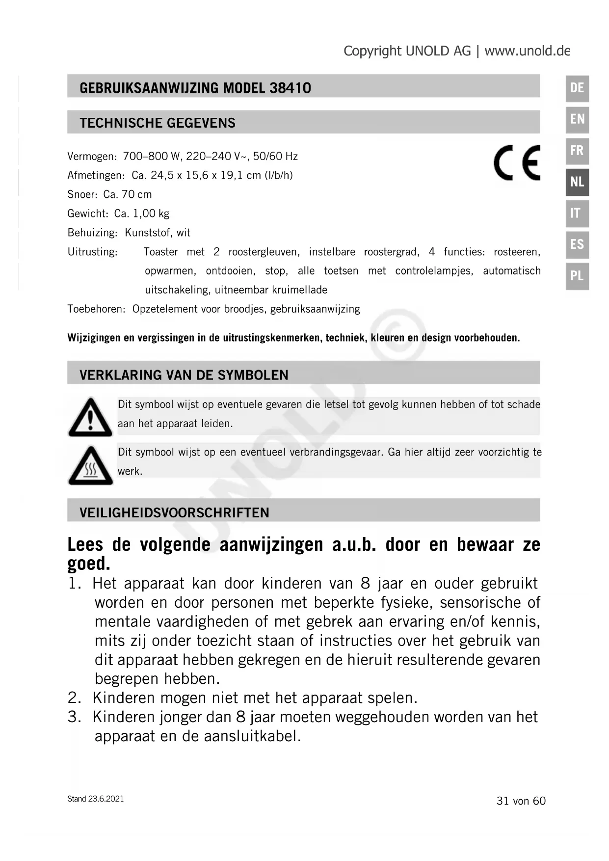 Dit symbool wijst op eventuele gevaren die letsel tot gevolg kunnen hebben of tot schade aan het apparaat leiden.Dit symbool wijst op een eventueel verbrandingsgevaar. Ga hier altijd zeer voorzichtig te werk. Copyright UNOLD AG | www.unold.de UNOLD ©32 von 60 Stand 23.6.2021