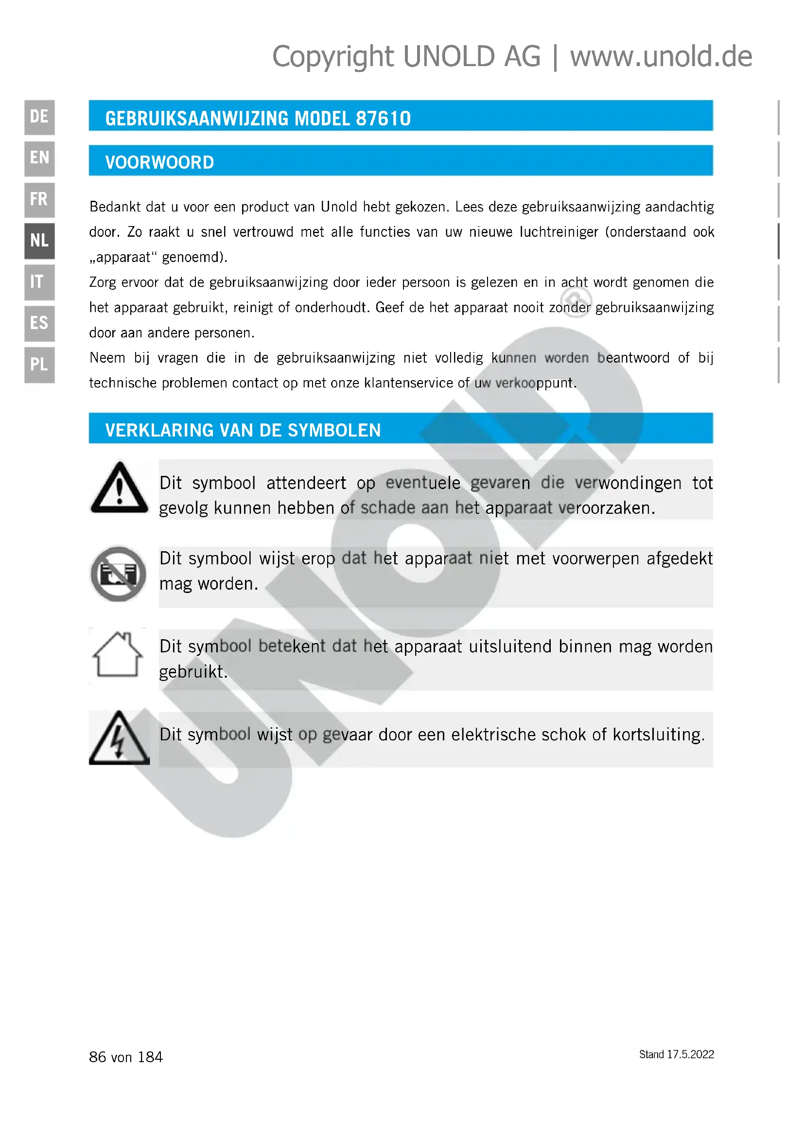Dit symbool attendeert op eventuele gevaren die verwondingen tot gevolg kunnen hebben of schade aan het apparaat veroorzaken. Dit symbool wijst op gevaar door een elektrische schok of kortsluiting. Dit symbool wijst erop dat het apparaat niet met voorwerpen afgedekt mag worden. Dit symbool betekent dat het apparaat uitsluitend binnen mag worden gebruikt. Copyright UNOLD AG | www.unold.deStand 17.5.2022 87 von 184