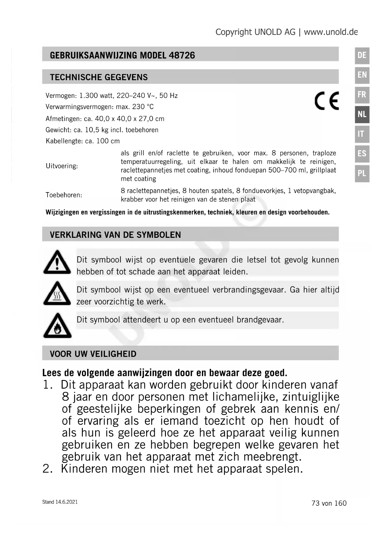 Dit symbool attendeert u op een eventueel brandgevaar. Copyright UNOLD AG | www.unold.de UNOLD ©74 von 160 Stand 14.6.2021