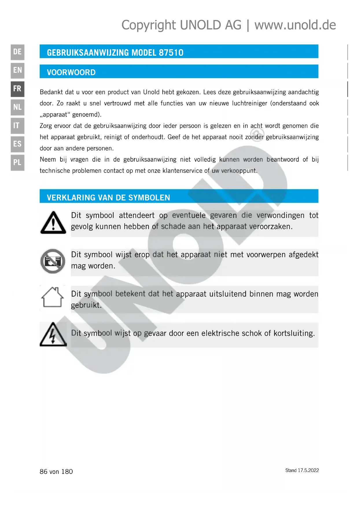 Dit symbool attendeert op eventuele gevaren die verwondingen tot gevolg kunnen hebben of schade aan het apparaat veroorzaken. Dit symbool wijst op gevaar door een elektrische schok of kortsluiting. Dit symbool wijst erop dat het apparaat niet met voorwerpen afgedekt mag worden. Dit symbool betekent dat het apparaat uitsluitend binnen mag worden gebruikt. Copyright UNOLD AG | www.unold.deStand 17.5.2022 87 von 180