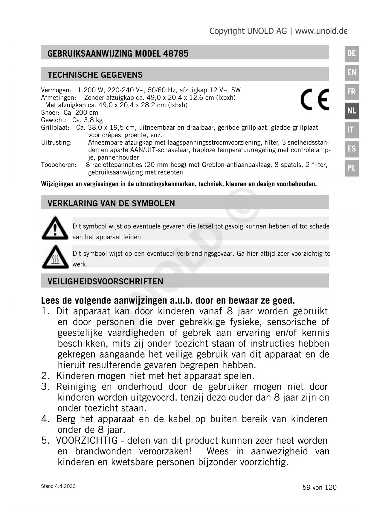 Wij geen op once apparaten een garantietermijn van 24 maanden (12 maanden bij commerciele gebruik), gerekend vanaf de dag van aanschaf. Deze garantie geldt voor schade, die bij correct gebruik aantoonbaar is veroorzaakt door een fouit in de productie. Binnen de garantietermijn verhelpen wij materiaal- en productiefouten door herstelling of vervangngaar onze keuze. Onze garantie is slechts geldig voor in Duitsland en Oostenrijk verkopte apparaten. In andere landen a.u.b. de importeur aanspreken. Apparaaten, waarvoor garantie in aanspraak worden genomen,要去en ons samen met een kopie van de machineel gezenererde kassabon waaruit de koopdatum duidelijk worden, alsmede een beschrijving van de fouit goed verpakt aan once klantenservice worden toe gezonden. U Aunt een retourbon afdrukken op once website www.unold.de/ruecksendung. (alleen voor inzendingen uit Duitsland en Oostenrijk). De garantie dekt geen schade veroorzaakt door slijtage, onbehoorlijk gebruik/ fouitve handelingen en Niet-naleving van de onderhouds- en reinigingsaanwijzingen. Hetrecht op garantie vervalt, wanner reparations of manipulaties aan het apparaat door derden worden doorgevoerd. Eventuele rechten van de eindgebruiker t.o.v. de verkoper of distributeur worden doorhee garantie Niet aangetast.