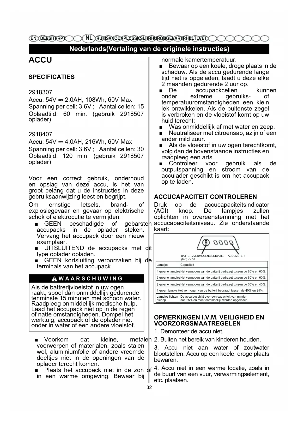 Accu: 54V 4.0AH, 216Wh, 60V Max Spanning per cell: 3.6V ; Aantal cellen: 30 Oplaadtijd: 120 min. (gebruik 2918507 oplader) Voor een correct gebruik, onderhoud en opslag van deze accu, is het van groot belang dat u de instructies in deze gebruiksaanwijzing leest en begrijpt. Om ernstige letsels, brand- of explosiegevaar en gevaar op elektrische schok of elektrocutie te vermijden: ■ GEEN beschadigde of gebarsten accupacks in de oplader steken. Vervang het accupack door een nieuw exemplaar. ■ UITSLUITEND de accupacks met dit type oplader opladen. ■ GEEN kortsluiting veroorzaken bij de terminals van het accupack. W A A R S C H U W I N G Als de battrerijvloeistof in uw ogen raakt, spoel dan onmiddellijk gedurende tenminste 15 minuten met schoon water. Raadpleeg onmiddellijk medische hulp. Laad het accupack niet op in de regen of natte omstandigheden. Dompel het werktuig, accupack of de oplader niet onder in water of een andere vloeistof. ■ Voorkom dat kleine, metalen voorwerpen of materialen, zoals stalen wol, aluminiumfolie of andere vreemde deeltjes niet in de openingen van de oplader terecht komen. ■ Plaats het accupack niet in de zon of in een warme omgeving. Bewaar bij normale kamertemperatuur. ■ Bewaar op een koele, droge plaats in de schaduw. Als de accu gedurende lange tijd niet is opgeladen, laadt u deze elke 2 maanden gedurende 2 uur op. ■ De accupackcellen kunnen onder extreme gebruiks- of temperatuuromstandigheden een klein lek ontwikkelen. Als de buitenste zegel is verbroken en de vloeistof komt op uw huid terecht: ■ Was onmiddellijk af met water en zeep. ■ Neutraliseer met citroensap, azijn of een ander mild zuur. ■ Als de vloeistof in uw ogen terechtkomt, volg dan de bovenstaande instructies en raadpleeg een arts. ■ Controleer voor gebruik als de outputspanning en stroom van de acculader geschikt is om het accupack op te laden. ACCUCAPACITEIT CONTROLEREN Druk op de accucapaciteitsindicator (ACI) knop. De lampjes zullen oplichten in overeenstemming met het accucapaciteitsniveau. Zie onderstaande kaart: Lampjes4 groene lampjes3 groene lampjes2 groene lampjes1 groen lampje Het vermogen van de batterij bedraagt tussen de 40% en 25%.Lampjes lichtenniet opDe accu beschikt over een capaciteit van minder dan 25% en moet onmiddellijk worden opgeladen. BATTERIJVERMOGENSINDICATIE (BVI) KNOP ACCUMETER CapaciteitHet vermogen van de batterij bedraagt tussen de 60% en 40%.Het vermogen van de batterij bedraagt tussen de 80% en 60%.Het vermogen van de batterij bedraagt tussen de 80% en 60%.