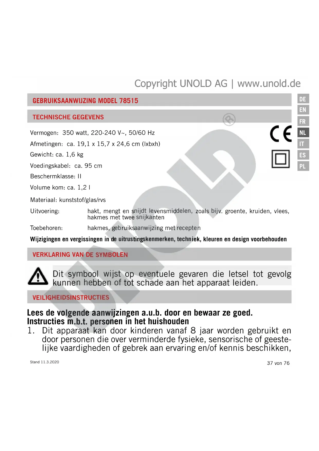 Dit symbool wijst op eventuele gevaren die letsel tot gevolg kunnen hebben of tot schade aan het apparaat leiden. Copyright UNOLD AG | www.unold.de38 von 76 Stand 11.3.2020