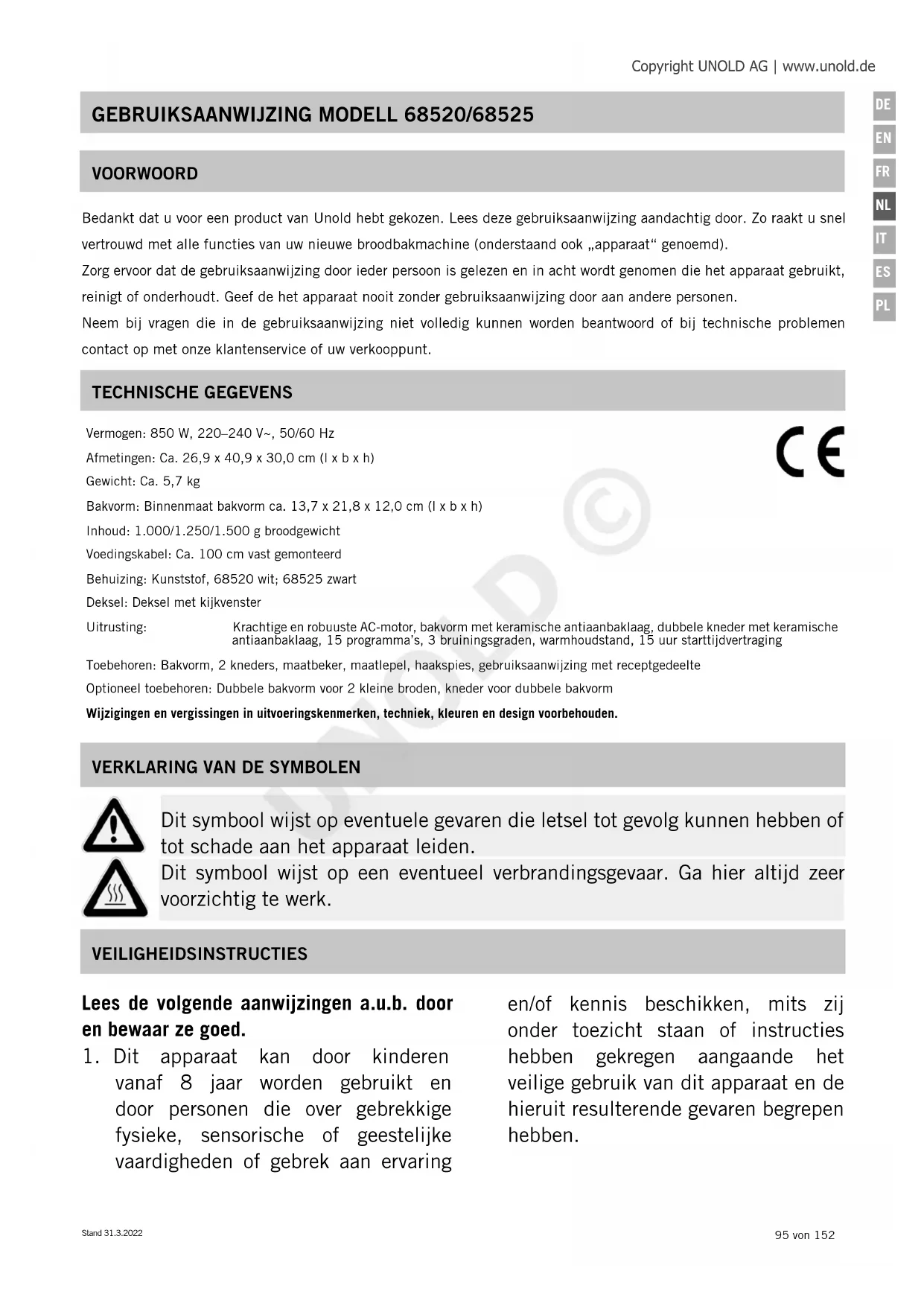 vanaf 8 jaar worden gebruikt en door personen die over gebrekkige fysieke, sensorische of geestelijke vaardigheden of gebrek aan ervaring en/of kennis beschikken, mits zij onder toezicht staan of instructies hebben gekregen aangaande het veilige gebruik van dit apparaat en de hieruit resulterende gevaren begrepen hebben. VOORWOORD Bedankt dat u voor een product van Unold hebt gekozen. Lees deze gebruiksaanwijzing aandachtig door. Zo raakt u snel vertrouwd met alle functies van uw nieuwe broodbakmachine (onderstaand ook „apparaat“ genoemd). Zorg ervoor dat de gebruiksaanwijzing door ieder persoon is gelezen en in acht wordt genomen die het apparaat gebruikt, reinigt of onderhoudt. Geef de het apparaat nooit zonder gebruiksaanwijzing door aan andere personen. Neem bij vragen die in de gebruiksaanwijzing niet volledig kunnen worden beantwoord of bij technische problemen contact op met onze klantenservice of uw verkooppunt. Copyright UNOLD AG | www.unold.de UNOLD ©96 von 152 Stand 31.3.2022