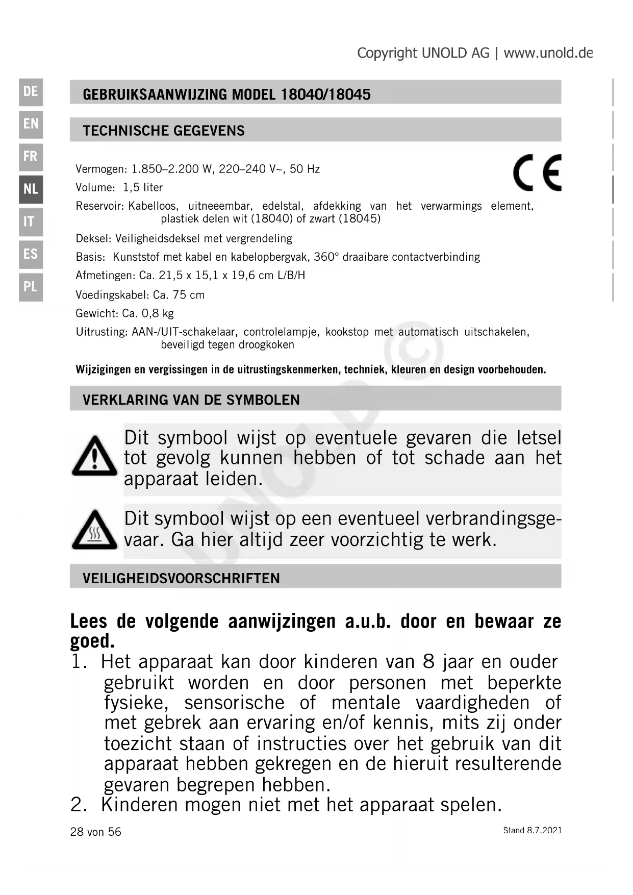 stopcontact trekken. Laat het apparaat nooit zonder toezicht wanneer de netstekker zich in het stopcontact bevindt. Copyright UNOLD AG | www.unold.de UNOLD ©Stand 8.7.2021 31 von 56