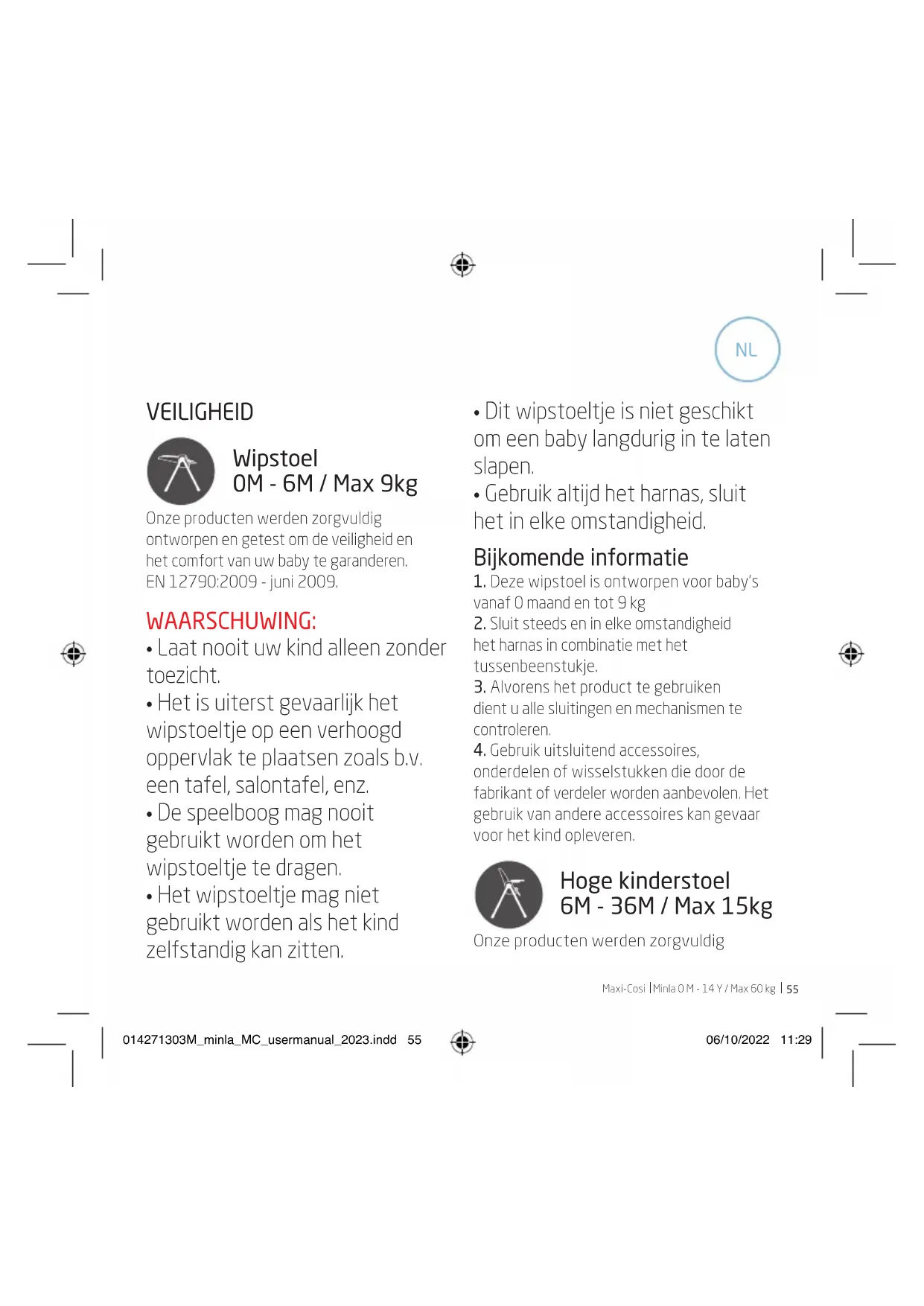 VEILIGHEID Wipstoel 0M - 6M / Max 9kg Onze producten werden zorgvuldig ontworpen en getest om de veiligheid en het comfort van uw baby te garanderen. EN 12790:2009 - juni 2009. WAARSCHUWING: