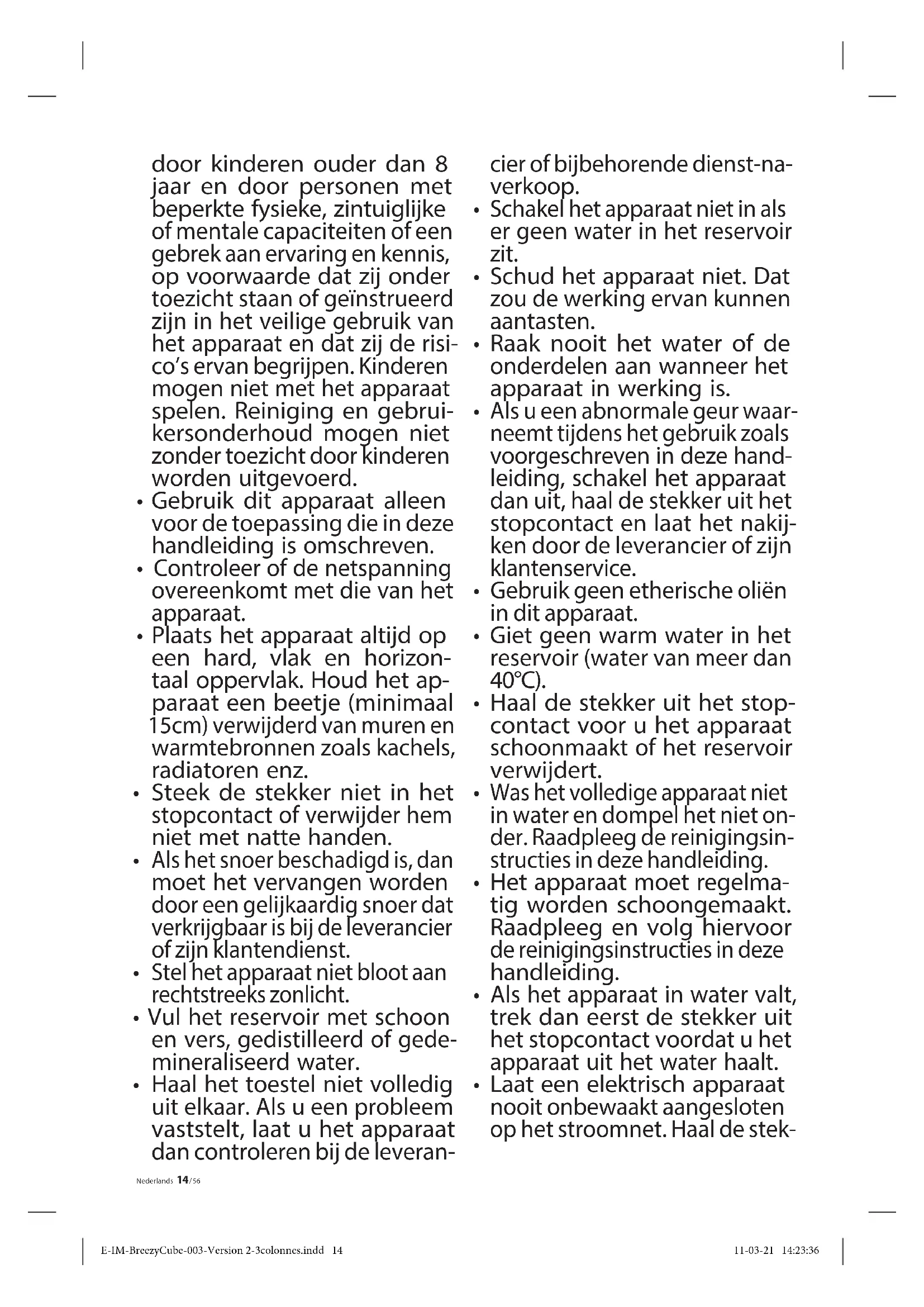 Laat een elektrisch apparaat nooit onbewaakt aangesloten op het stroomnet. Haal de stek- E-IM-BreezyCube-003-Version 2-3colonnes.indd 14E-IM-BreezyCube-003-Version 2-3colonnes.indd 14 11-03-21 14:23:3611-03-21 14:23:3615 / 56 Nederlands ker uit het stopcontact wanneer u het apparaat niet gebruikt.