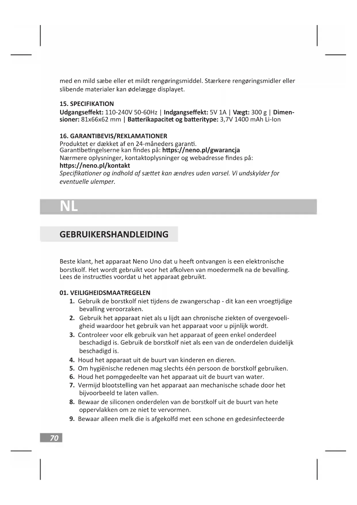 Produktet er dækket af en 24-måneders garan. Garanbengelserne kan ndes på: hps://neno.pl/gwarancja Nærmere oplysninger, kontaktoplysninger og webadresse ndes på: hps://neno.pl/kontakt Specikaoner og indhold af sæet kan ændres uden varsel. Vi undskylder for eventuelle ulemper. Beste klant, het apparaat Neno Uno dat u hee ontvangen is een elektronische borstkolf. Het wordt gebruikt voor het aolven van moedermelk na de bevalling. Lees de instruces voordat u het apparaat gebruikt.