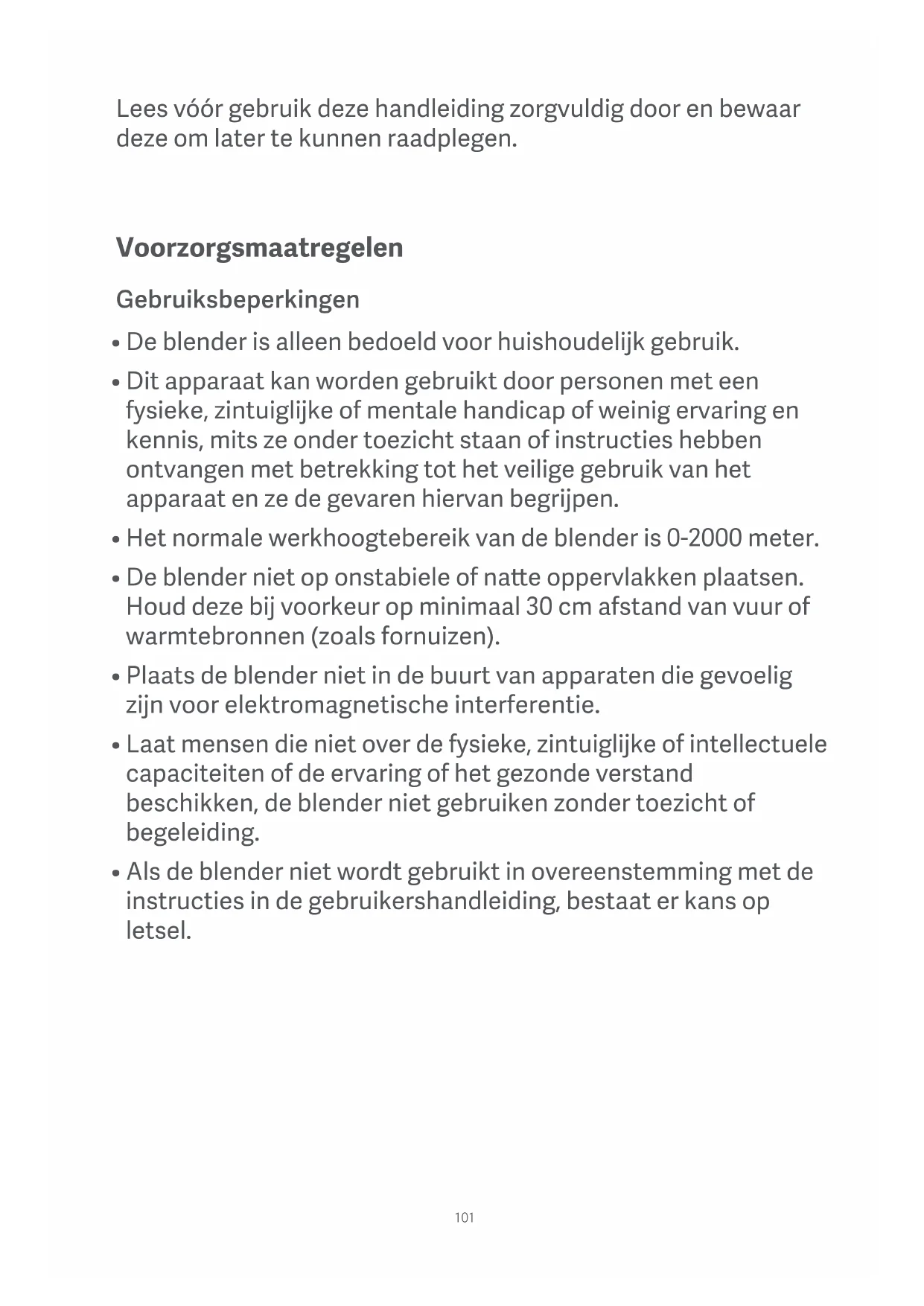 - Laat mensen die niet over de fysieke, zintuiglijke of intellectuele capaciteiten of de ervaring of het gezonde verstand beschikken, de blender niet gebruiken zonder toezicht of begeleiding.