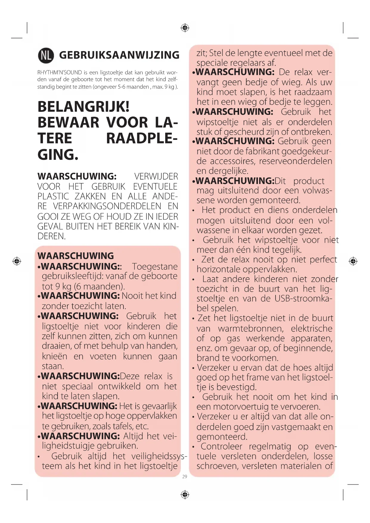 - WAARSCHUWING: De relax ver- vangt geen bedje of wieg. Als uw kind moet slapen, is het raadzaam het in een wieg of bedje te leggen.