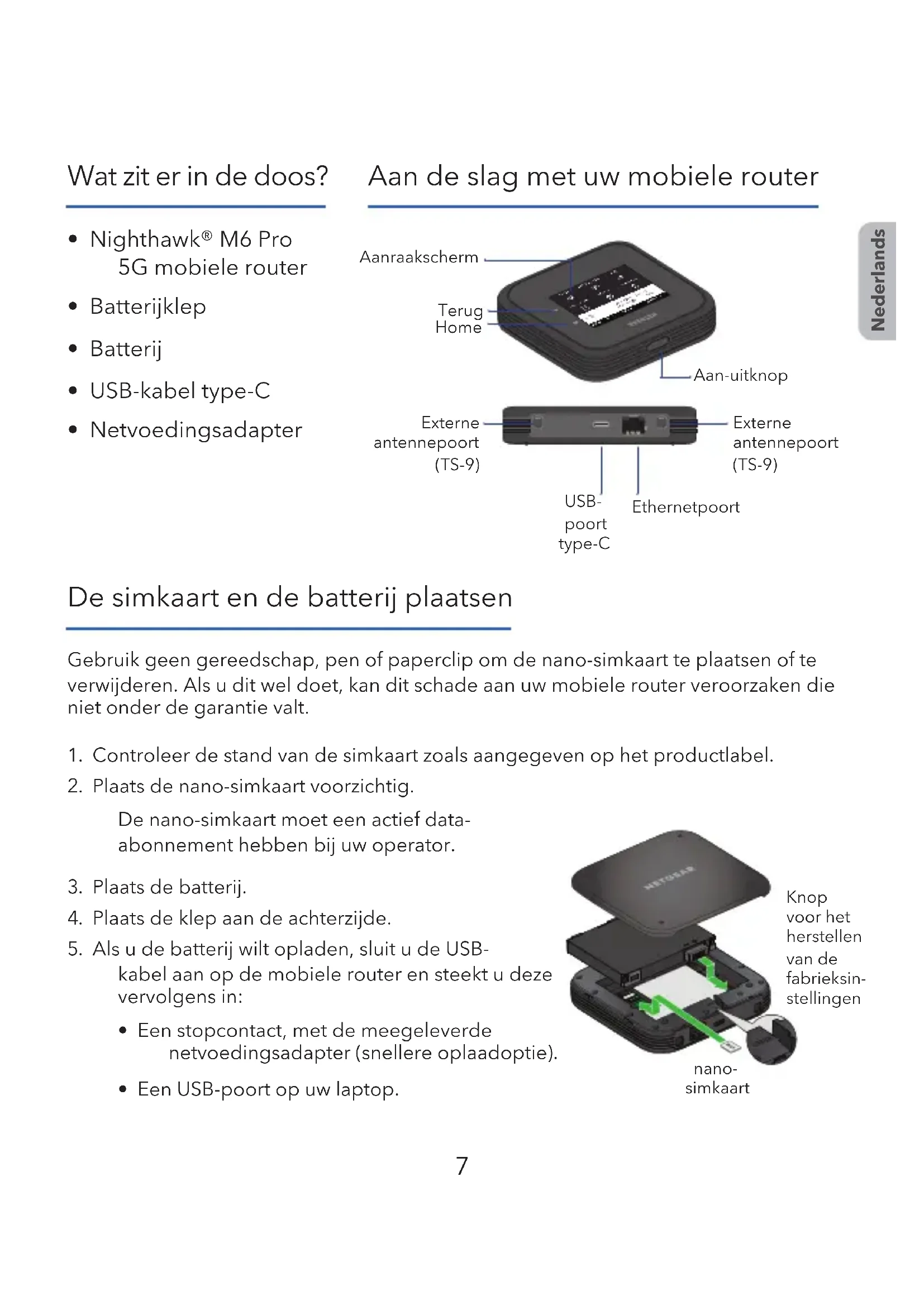 - Netvoedingsadapter Aan de slag met uw mobiele router Nederlands EthernetpoortExterne antennepoort (TS-9)Externe antennepoort (TS-9) USB- poort type-CAan-uitknop Home TerugAanraakscherm De simkaart en de batterij plaatsen Gebruik geen gereedschap, pen of paperclip om de nano-simkaart te plaatsen of te verwijderen. Als u dit wel doet, kan dit schade aan uw mobiele router veroorzaken die niet onder de garantie valt.