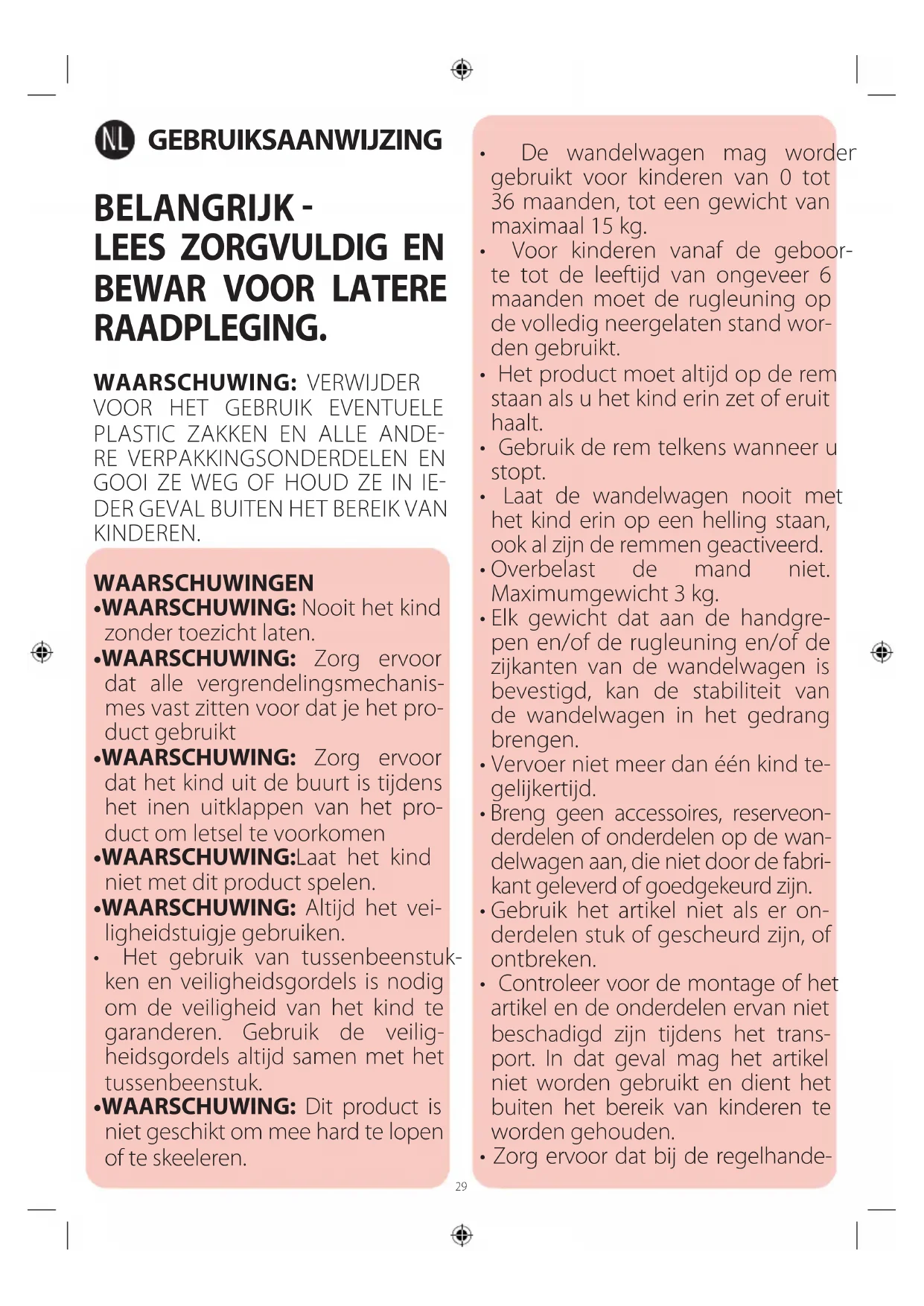 - De wandelwagen mag worden gebruikt voor kinderen van 0 tot 36 maanden, tot een gewicht van maximaal 15 kg.