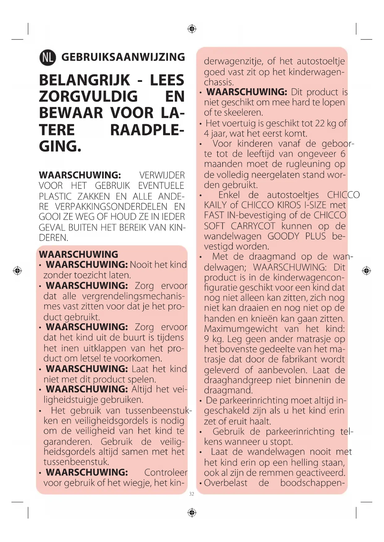 - WAARSCHUWING: Controleer voor gebruik of het wiegje, het kin- derwagenzitje, of het autostoeltje goed vast zit op het kinderwagen- chassis.
