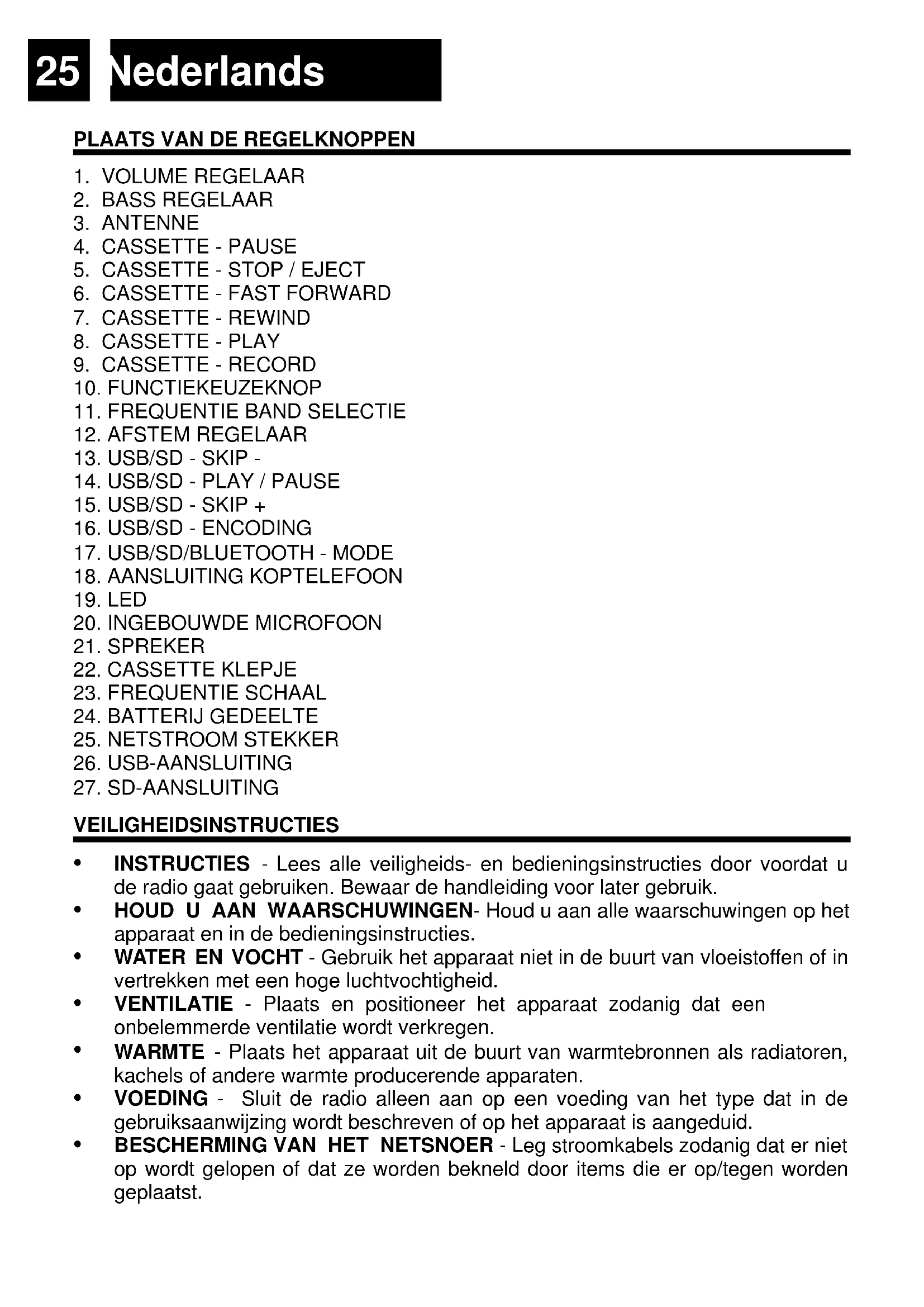 ONDERHOUD - Gebruiker mag geen onderhoud aan het apparaat uitvoeren dat niet in de gebruiksaanwijzing wordt genoemd. Alle onderhoudswerkzaamheden moeten door gekwalificeerde technici worden uitgevoerd. Let op: Als gevolg van een elektrostatische ontlading functioneert het display mogelijk dat niet correct of reageert het apparaat niet op de bedieningsknoppen. Schakel het apparaat dan uit, koppel het los en verwijder alle batterijen en sluit het na enkele seconden opnieuw aan. STROOMBRONNEN WISSELSTROOM: u sluit uw draagbare stereosysteem op de stroom aan door het netsnoer aan het aansluitpunt (25) aan de achterkant van het apparaat aan te brengen en de stekker in een stopcontact in de muur te steken. Controleer of de nominale spanning van uw apparaat overeenkomt met uw lokale voltage. Zorg ervoor dat het netsnoer volledig in het apparaat is aangebracht. BATTERIJSTROOM: om de radio met batterijen te gebruiken, haalt u de stekker uit het stopcontact en plaatst u 4 × "LR20" -batterijen in het vakje (24). Controleer, ter voorkoming van schade aan het apparaat, of de batterijen correct zijn geplaatst.Verwijder de batterijen als de radio gedurende langere tijd niet wordt gebruikt. Dit ter voorkoming van lekkage van de batterijen en schade aan de radio.