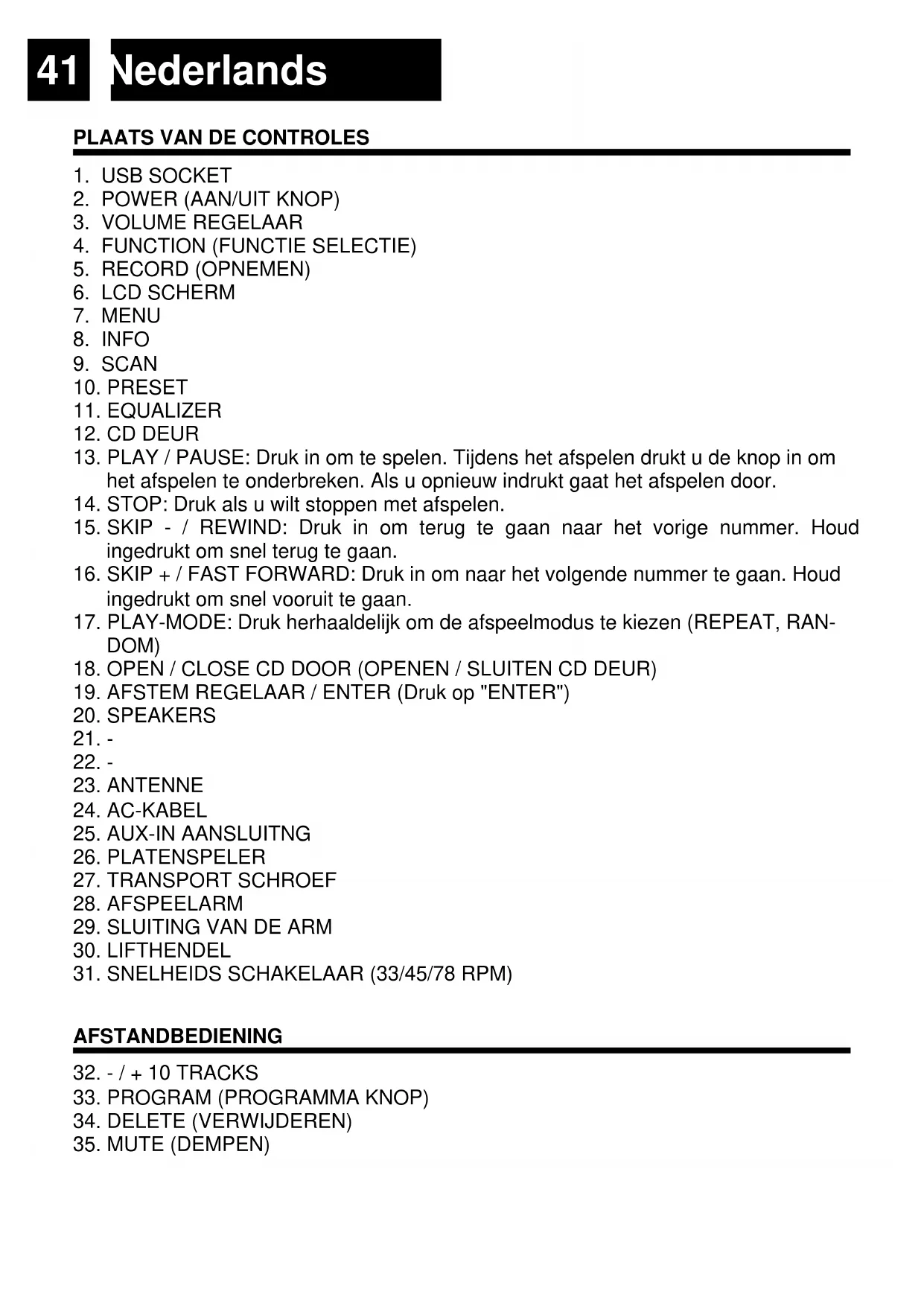 stoppen en de [AFSPEELARM] (28) keert terug naar de steun. Om de [PLATENSPELER] (26) te stoppen tijdens het afspelen, dient de [AFSPEELARM] (28) te worden opgeheven en op de steun te worden geplaatst. Opmerking: De [PLATENSPELER] (26) niet handmatig draaien. Wanneer het apparaat wordt verplaatst of vervoerd: Vergrendel [AFSPEELARM] (28) met de [SLUITING VAN DE ARM] (29). Plaats de beschermkap van de naald (ook wanneer deze niet in gebruik is). Schroef de [TRANSPORT-SCHROEF] (27) tegen de klok in totdat u weerstand voelt (niet helemaal schroeven).