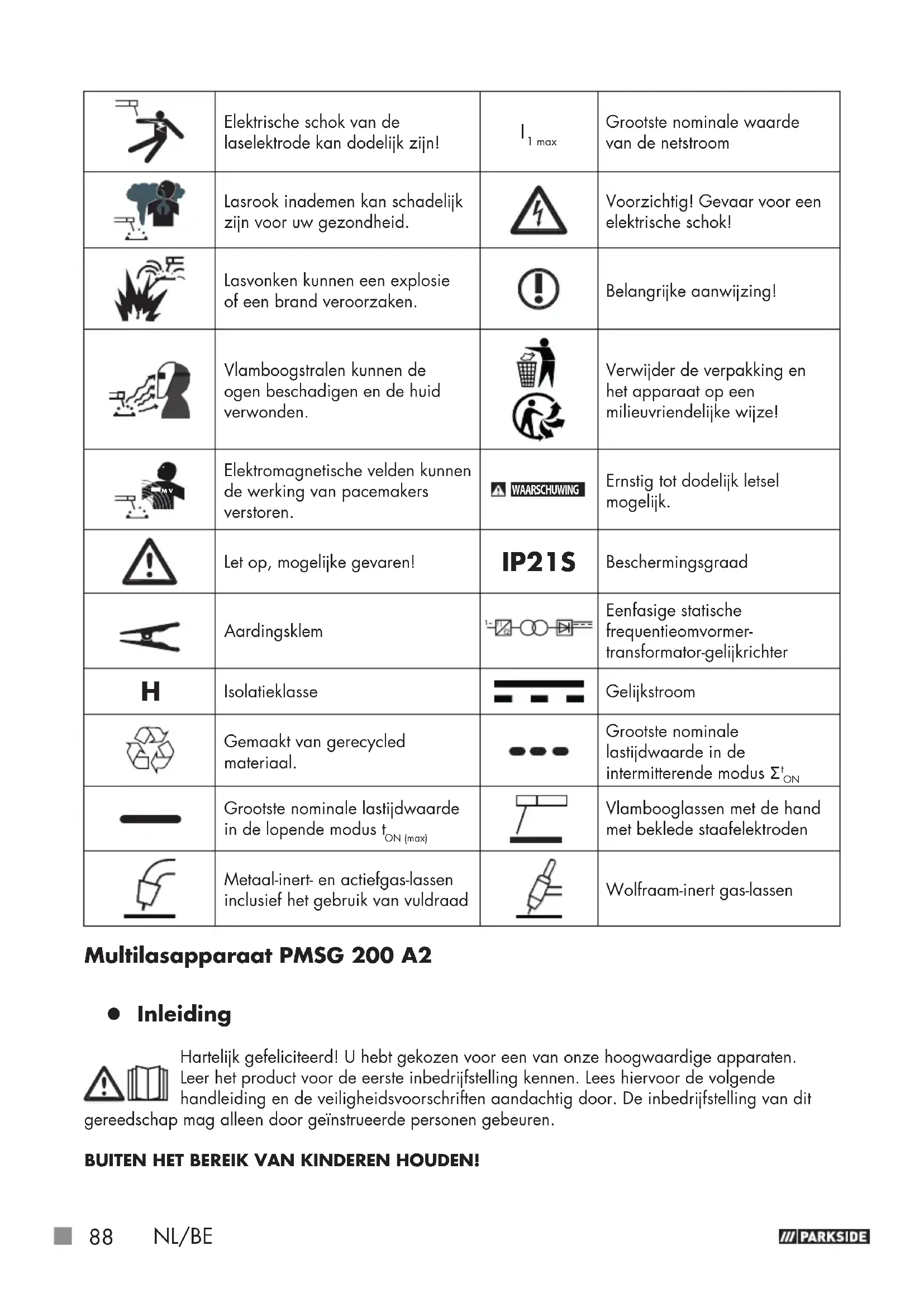 Grootste nominale lastijdwaarde in de lopende modus t ON (max) Vlambooglassen met de hand met beklede staafelektroden Metaal-inert- en actiefgas-lassen inclusief het gebruik van vuldraad Wolfraam-inert gas-lassen Multilasapparaat PMSG 200 A2 z Inleiding Hartelijk gefeliciteerd! U hebt gekozen voor een van onze hoogwaardige apparaten. Leer het product voor de eerste inbedrijfstelling kennen. Lees hiervoor de volgende handleiding en de veiligheidsvoorschriften aandachtig door. De inbedrijfstelling van dit gereedschap mag alleen door geïnstrueerde personen gebeuren. BUITEN HET BEREIK VAN KINDEREN HOUDEN!NL/BE