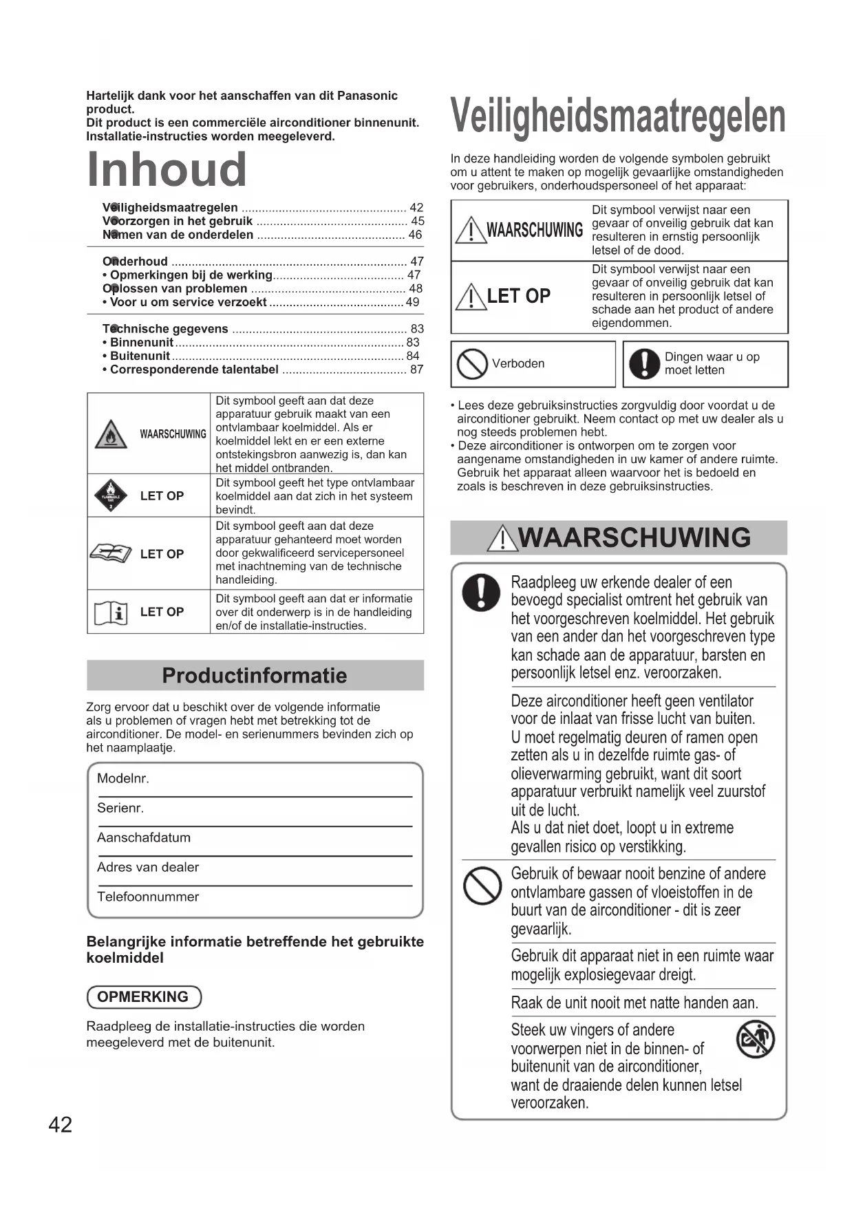 - Corresponderende talentabel ..................................... 87 Inhoud Veiligheidsmaatregelen Productinformatie Zorg ervoor dat u beschikt over de volgende informatie als u problemen of vragen hebt met betrekking tot de airconditioner. De model- en serienummers bevinden zich op het naamplaatje.Modelnr. Serienr. AanschafdatumAdres van dealerTelefoonnummer Raadpleeg uw erkende dealer of een bevoegd specialist omtrent het gebruik van het voorgeschreven koelmiddel. Het gebruik van een ander dan het voorgeschreven type kan schade aan de apparatuur, barsten en persoonlijk letsel enz. veroorzaken. Deze airconditioner heeft geen ventilator voor de inlaat van frisse lucht van buiten. U moet regelmatig deuren of ramen open zetten als u in dezelfde ruimte gas- of olieverwarming gebruikt, want dit soort apparatuur verbruikt namelijk veel zuurstof uit de lucht. Als u dat niet doet, loopt u in extreme gevallen risico op verstikking. Gebruik of bewaar nooit benzine of andere ontvlambare gassen of vloeistoffen in de buurt van de airconditioner - dit is zeer gevaarlijk. Gebruik dit apparaat niet in een ruimte waar mogelijk explosiegevaar dreigt. Raak de unit nooit met natte handen aan. Steek uw vingers of andere voorwerpen niet in de binnen- of buitenunit van de airconditioner, want de draaiende delen kunnen letsel veroorzaken. In deze handleiding worden de volgende symbolen gebruikt om u attent te maken op mogelijk gevaarlijke omstandigheden voor gebruikers, onderhoudspersoneel of het apparaat: WAARSCHUWING Dit symbool verwijst naar een gevaar of onveilig gebruik dat kan resulteren in ernstig persoonlijk letsel of de dood. LET OP Dit symbool verwijst naar een gevaar of onveilig gebruik dat kan resulteren in persoonlijk letsel of schade aan het product of andere eigendommen. WAARSCHUWING Hartelijk dank voor het aanschaffen van dit Panasonic product.Dit product is een commerciële airconditioner binnenunit.Installatie-instructies worden meegeleverd.VerbodenDingen waar u op moet letten• Lees deze gebruiksinstructies zorgvuldig door voordat u de airconditioner gebruikt. Neem contact op met uw dealer als u nog steeds problemen hebt.• Deze airconditioner is ontworpen om te zorgen voor aangename omstandigheden in uw kamer of andere ruimte. Gebruik het apparaat alleen waarvoor het is bedoeld en zoals is beschreven in deze gebruiksinstructies.WAARSCHUWINGDit symbool geeft aan dat deze apparatuur gebruik maakt van een ontvlambaar koelmiddel. Als er koelmiddel lekt en er een externe ontstekingsbron aanwezig is, dan kan het middel ontbranden.LET OPDit symbool geeft het type ontvlambaar koelmiddel aan dat zich in het systeem bevindt.LET OPDit symbool geeft aan dat deze apparatuur gehanteerd moet worden door gekwaliceerd servicepersoneel met inachtneming van de technische handleiding.LET OPDit symbool geeft aan dat er informatie over dit onderwerp is in de handleiding en/of de installatie-instructies.Belangrijke informatie betreffende het gebruikte koelmiddelOPMERKINGRaadpleeg de installatie-instructies die worden meegeleverd met de buitenunit. OI_00_301035_all.indb 42 2018/7/4 10:53:4943 NEDERLANDS WAARSCHUWING Als het koelmiddel in contact komt met vuur, zal dit een giftig gas produceren. Zorg er om veiligheidsredenen voor dat u de airconditioner uitschakelt en ook de stekker uit het stopcontact haalt voordat u het apparaat reinigt of onderhoud pleegt. Trek in geval van nood de stekker van het netsnoer uit het stopcontact of schakel de stroomonderbreker uit, of schakel de hoofdschakelaar uit om de airconditioner volledig los te koppelen van de netstroom. Verwijderen in overeenstemming met landelijke en/of plaatselijke regelgeving. Dit product mag in geen geval worden gewijzigd of gedemonteerd. Een gewijzigde of gedemonteerde unit kan leiden tot brand, elektrische schokken, of letsel. Reinig nooit zelf het binnenste van de binnen- en buitenunits. Laat de reiniging uitvoeren door een bevoegde dealer of specialist. Repareer bij storingen dit apparaat niet zelf. Neem voor reparatie en verwijdering contact op met uw dealer of reparateur. Gebruik geen aangepaste snoeren, snoeren die gedeeld worden met andere apparatuur, verlengsnoeren of snoeren die niet aan de specicaties voldoen om oververhitting en brand te vermijden. Zorg voor een apart stopcontact dat uitsluitend bestemd is voor elk individueel toestel en een stroomonderbreker, aardlekschakelaar of verliesstroomschakelaar ter beveiliging tegen te hoge stromen in de uitsluitend voor de apparatuur bestemde stroomleiding. Zorg voor een apart stopcontact voor elke unit en zorg ervoor dat conform de regelgeving voor elektrische bedrading er volledige ontkoppeling, dat wil zeggen een ontkoppeling van het stopcontact in alle polen, wordt geïmplementeerd in de vaste bedrading. Ter voorkoming van mogelijke gevaren vanwege defecte isolatie moet de unit worden geaard. Het toestel moet worden bewaard in een ruimte waarin zich geen doorlopend werkende ontstekingsbronnen bevinden (bijvoorbeeld: open vuur, een werkend gasapparaat, of een werkend elkektrisch verwarmingstoestel). Let op, want koelmiddel kan geurloos zijn. Een ongeventileerde plek waar een toestel dat gebruik maakt van ontvlambare koelmiddelen wordt geïnstalleerd, moet zo zijn geconstrueerd dat het koelmiddel in geval van een lekkage niet kan blijven staan zodat er brandgevaar en ontplofngsgevaar ontstaat. Het toestel moet worden bewaard op een goed geventileerde plek en de afmetingen van de ruimte moeten overeenkomen met de afmetingen van de ruimte waarin het toestel volgens de specicaties gebruikt moet worden. Nadat installatie van de unit bent u verplicht de installateur te vragen naar het vloeroppervlak van de ruimte waarin de unit is aangebracht en de hoeveelheid koelmiddel in het systeem. Als de unit of de indeling van de ruimte wordt veranderd, bent u verplicht de dealer of servicevertegenwoordiger te raadplegen. Gebruik geen andere middelen dan die worden aanbevolen door de fabrikant om het ontdo