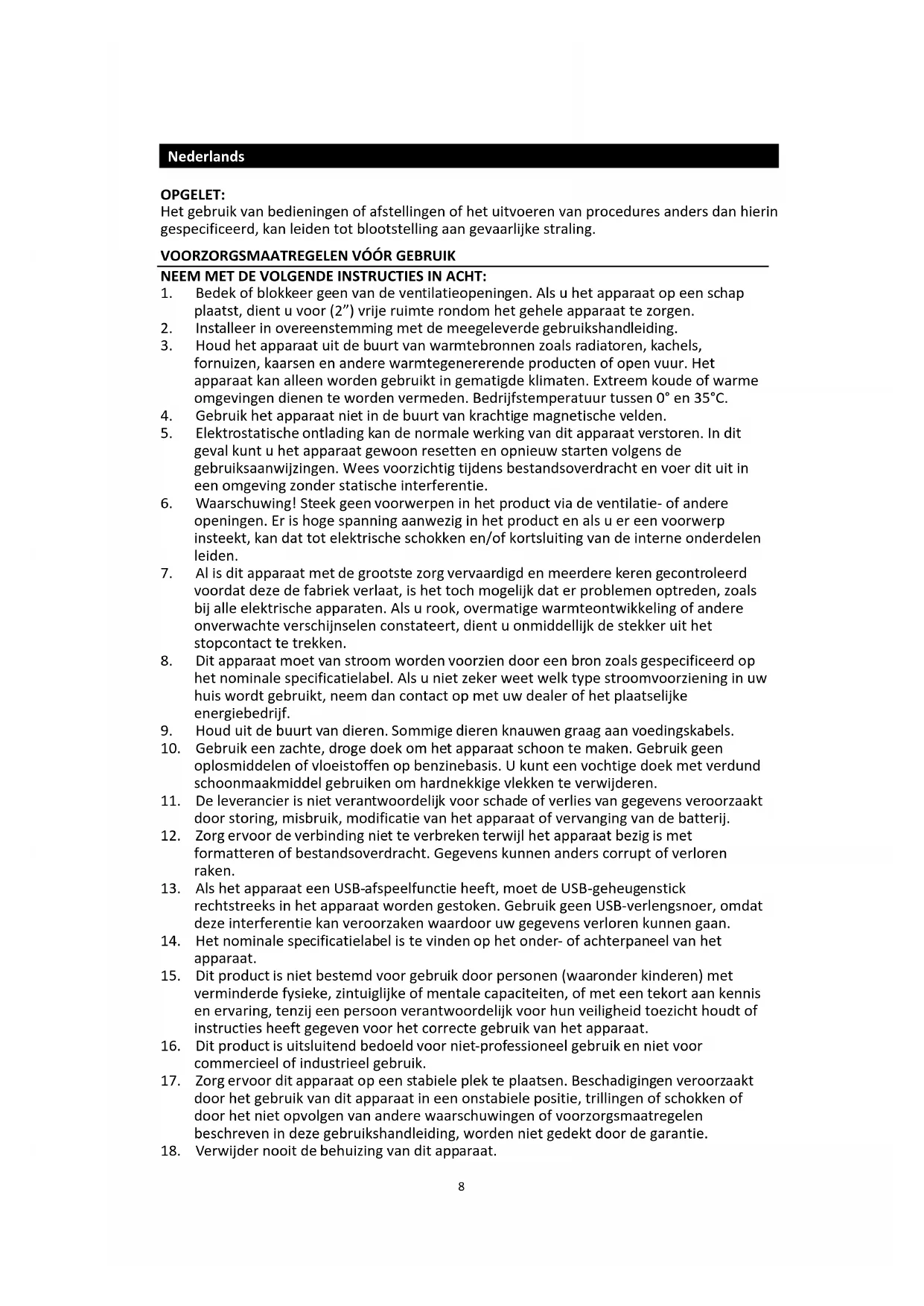 - Houd het apparaat UIT de buurt van warmtebronnen zoals radiatoren, kachels, fornuizen, kaarsen en andere warmtegenererende producten of open vuur. Het apparaat kan alleen worden gezruikt in gematigde klimaten. Extreem foude of warmer omgevingen dienen to worden vermeden. Bedrijsttemperatuur:tussen 0^ en 35^