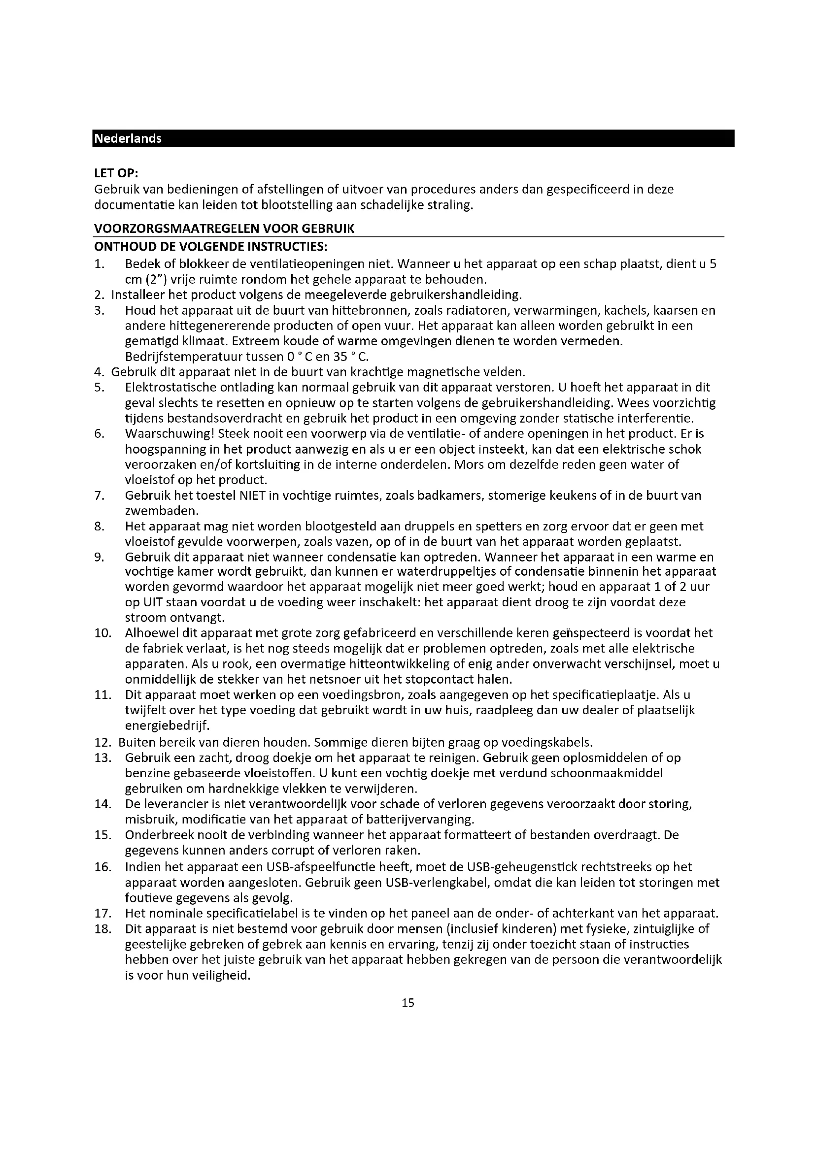 22. Plaats dit apparaat nooit op andere elektrische apparatuur.