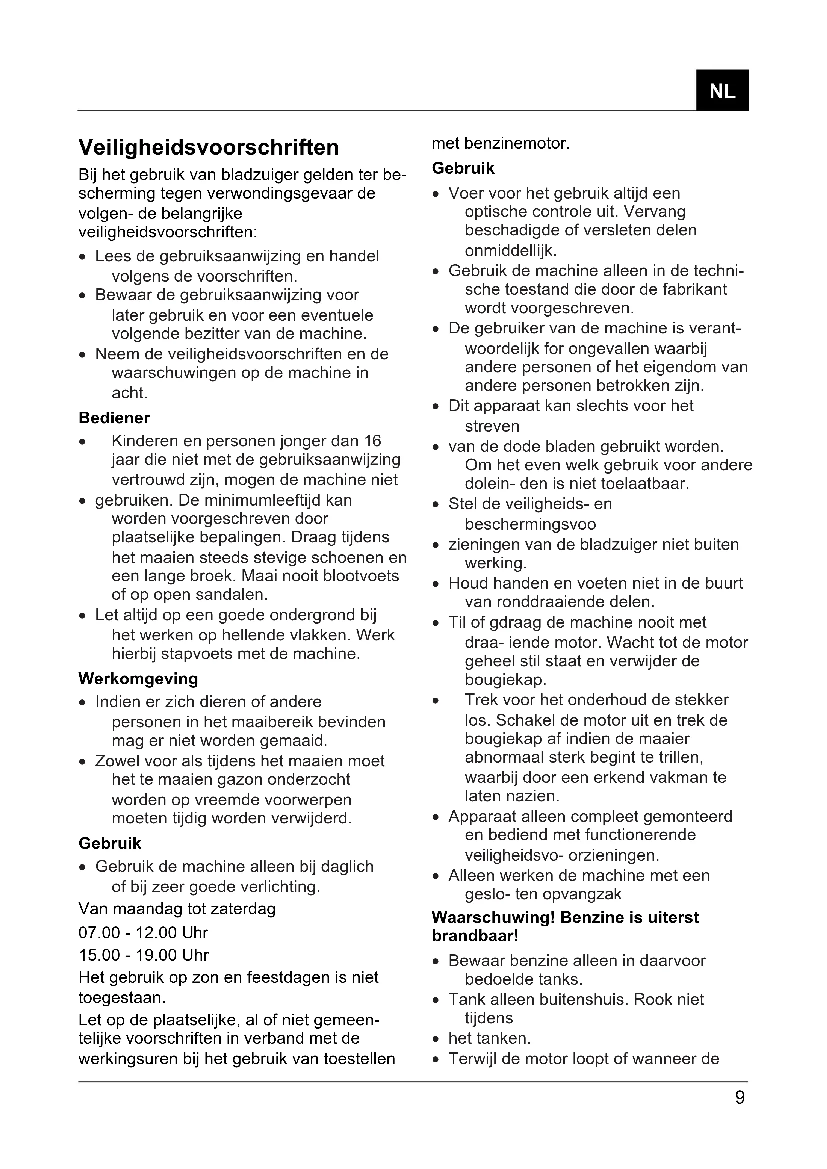 Veiligheidsvoorschriften Bij het gebruik van bladzuiger gelden ter be- scherming tegen verwondingsgevaar de volgen- de belangrijke veiligheidsvoorschriften: