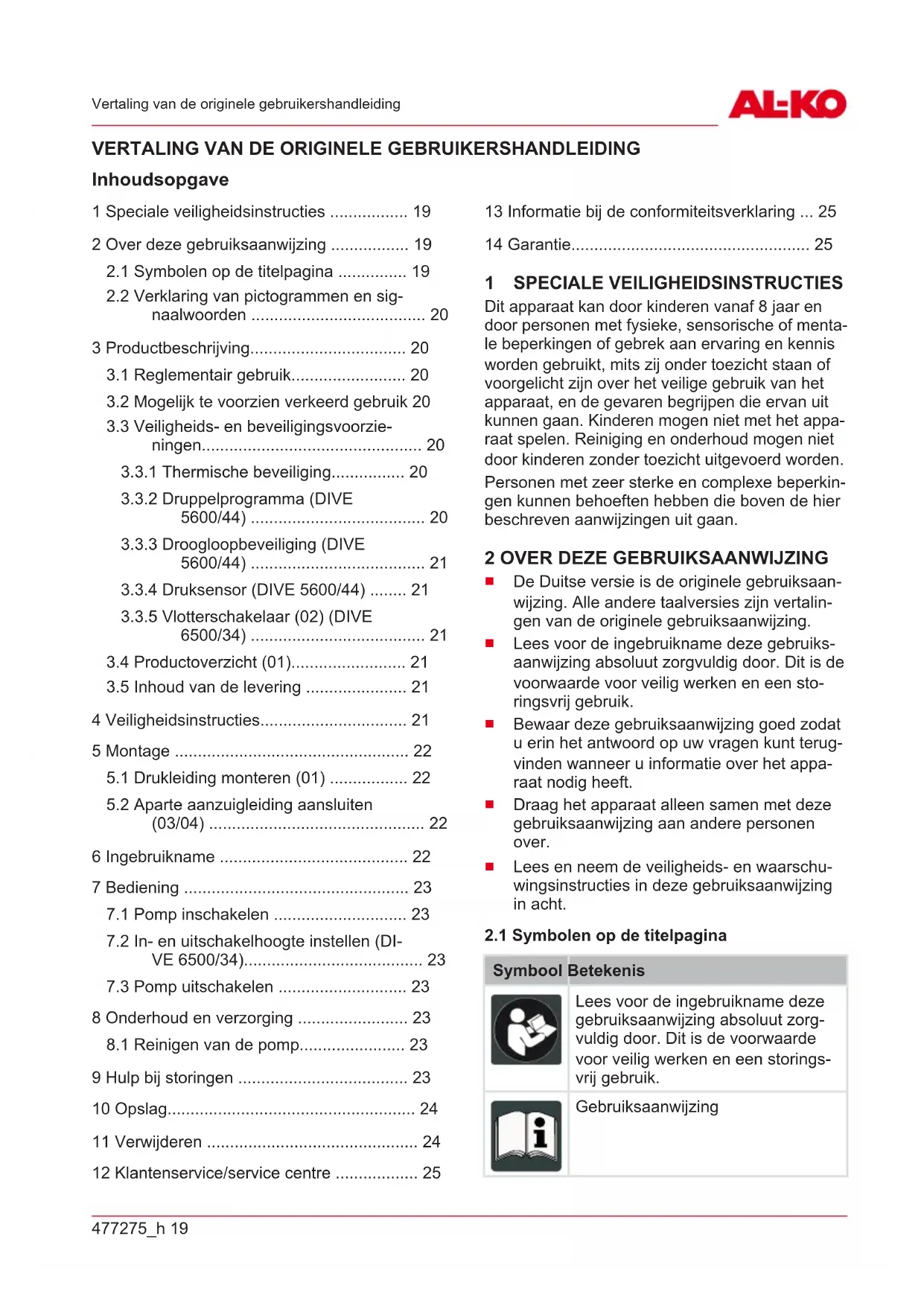 Download de handleiding voor uw Pomp in PDF-formaat gratis! Vind uw handleiding Dive 560044 - AL-KO en neem uw elektronisch apparaat weer in handen. Op deze pagina staan alle documenten die nodig zijn voor het gebruik van uw apparaat. Dive 560044 van het merk AL-KO.