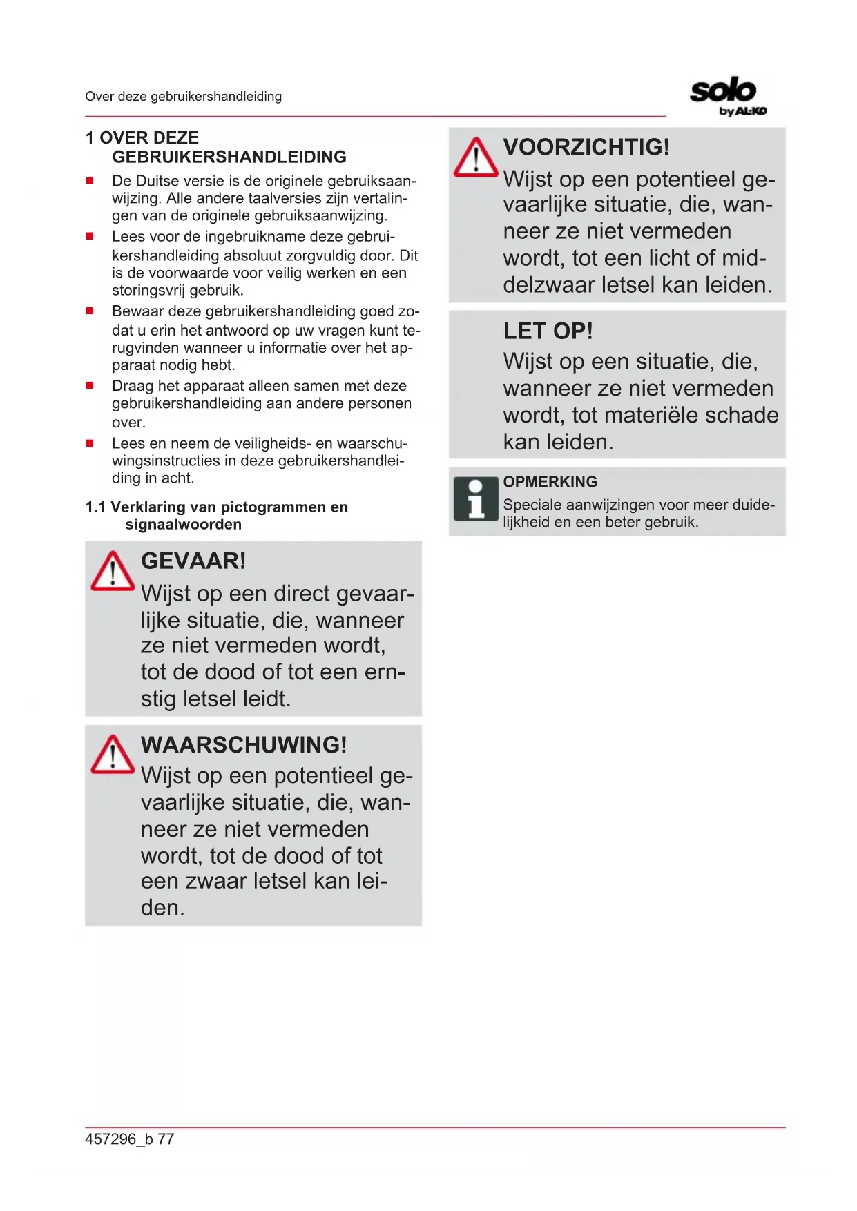 Symbool Betekenis Houd anderen uit de buurt van de gevarenzone! Vereist extra voorzichtigheid tijdens gebruik! Blijf met uw handen en voeten bij de maaier vandaan! Houd voldoende afstand! Lees vóór ingebruikname de ge- bruiksaanwijzing! Voer voor het starten van het appa- raat het PIN in! Rijd niet op het apparaat mee!