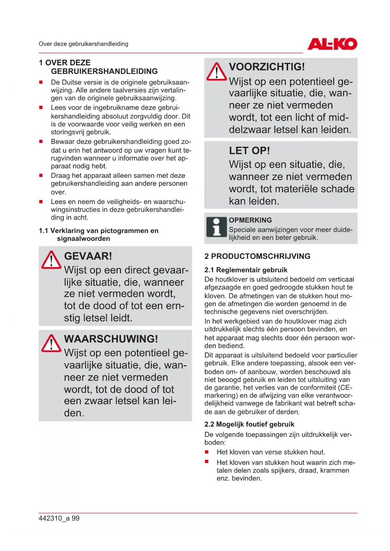 Het apparaat nooit gebruiken met versleten of defecte on- derdelen. Defecte onderdelen altijd vervangen door oor- spronkelijke reserveonderde- len van de fabrikant. Wanneer het apparaat met versleten of defecte onderdelen wordt ge- bruikt, kan tegenover de fabri- kant geen aanspraak op ga- rantie worden gemaakt. OPMERKING Reparatiewerkzaamheden mogen uitsluitend worden uitgevoerd in de vakhandel of op onze AL-KO Service- vestigingen.