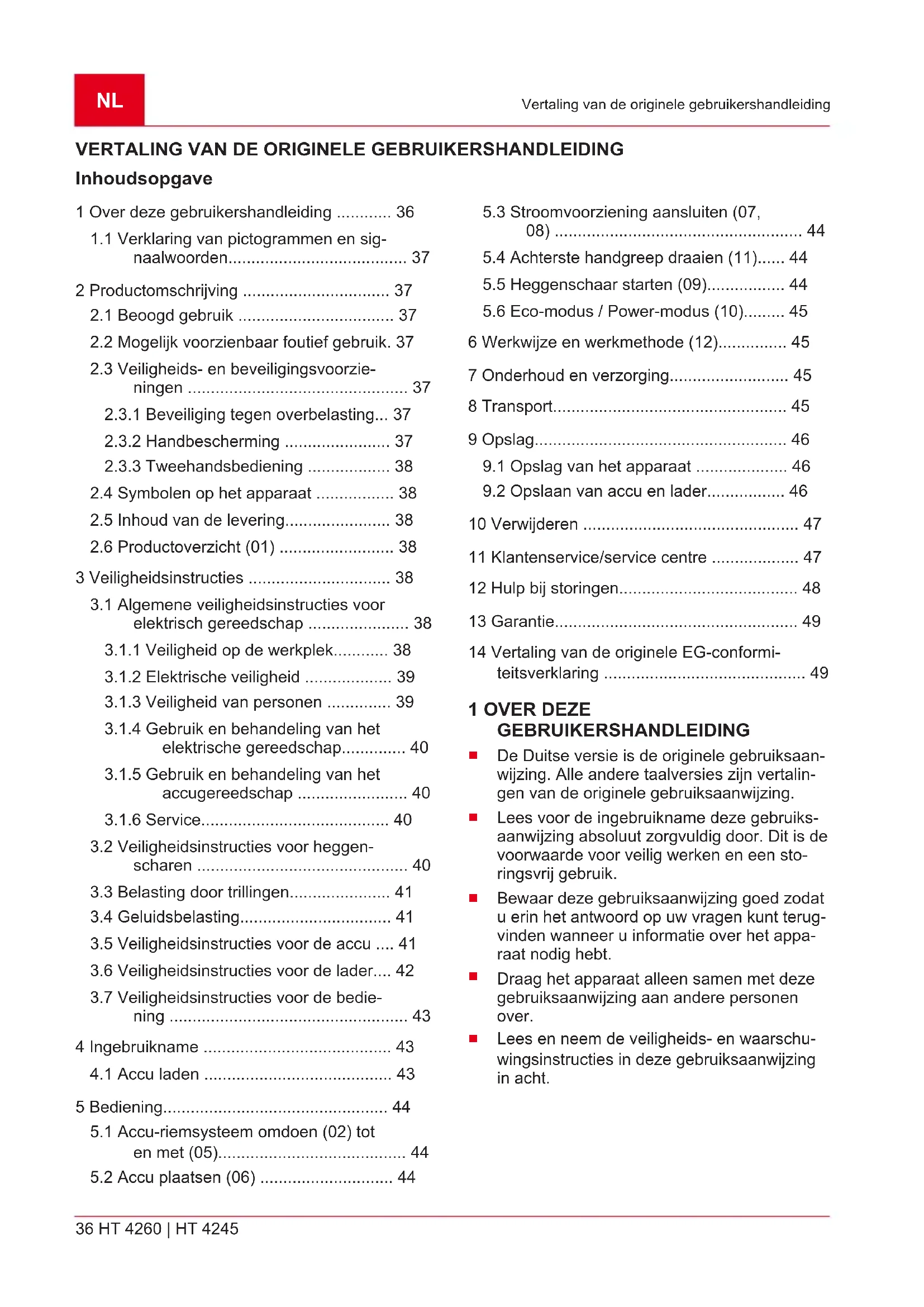 Een verzamelpunt van de fabrikant (indien hij geen lid is van het gemeenschappelijke recy- cling systeem) Deze voorschriften zijn alleen voor toepassing op accu’s en batterijen die in landen van de Europe- se Unie verkocht werden en die beantwoorden aan de Europese richtlijn 2006/66/EU. In landen buiten de Europese Unie kunnen afwijkende be- palingen voor de recycling van accu’s en batterij- en gelden. 11 KLANTENSERVICE/SERVICE CENTRE Voor vragen over garantie, reparatie of reserve- onderdelen kunt u contact opnemen met het dichtstbijzijnde AL-KOservice centre. Deze vindt u op internet op het volgende adres: www.al-ko.com/service-contactsNL 48 HT 4260 | HT 4245 Hulp bij storingen