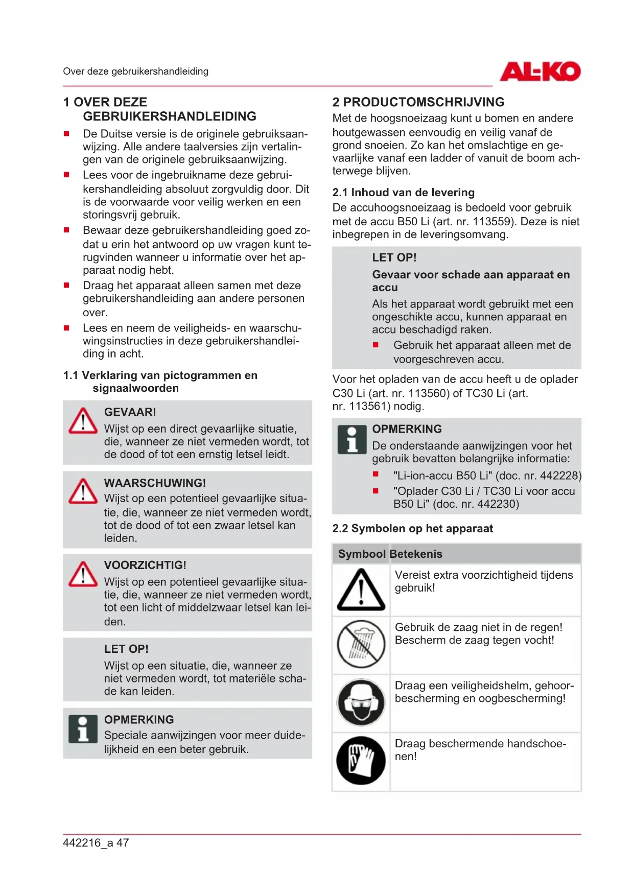 De accuhoogsnoeizaag is bedoeld voor gebruik met de accu B50 Li (art. nr. 113559). Deze is niet inbegrepen in de leveringsomvang. LET OP! Gevaar voor schade aan apparaat en accu Als het apparaat wordt gebruikt met een ongeschikte accu, kunnen apparaat en accu beschadigd raken.