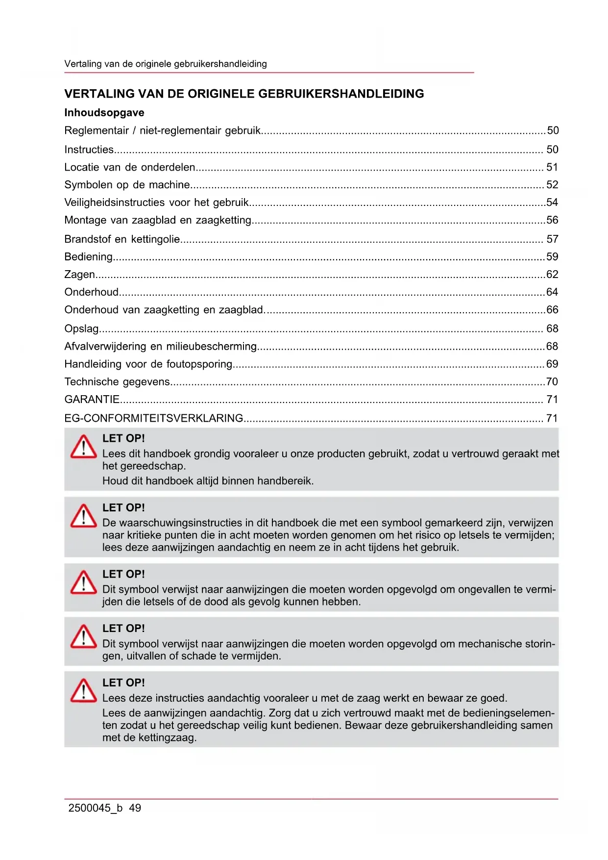 - EG-CONFORMITEITSVERKLARING LET OP! Lees dit handboek grondig vooraleer u onze producten gebruikt, zodat u vertrouwd geraakt met het gereedschap. Houd dit handboek altijd binnen handbereik. LET OP! De waarschuwingsinstructies in dit handboek die met een symbool gemarkeerd zijn, verwijzen naar kritieke punten die in acht moeten worden genomen om het risico op letsels te vermijden; lees deze aanwijzingen aandachtig en neem ze in acht tijdens het gebruik. LET OP! Dit symbool verwijst naar aanwijzingen die moeten worden opgevolgd om ongevallen te vermi- jden die letsels of de dood als gevolg kunnen hebben. LET OP! Dit symbool verwijst naar aanwijzingen die moeten worden opgevolgd om mechanische storin- gen, uitvallen of schade te vermijden. LET OP! Lees deze instructies aandachtig vooraleer u met de zaag werkt en bewaar ze goed. Lees de aanwijzingen aandachtig. Zorg dat u zich vertrouwd maakt met de bedieningselemen- ten zodat u het gereedschap veilig kunt bedienen. Bewaar deze gebruikershandleiding samen met de kettingzaag.nl Vertaling van de originele gebruikershandleiding 50 2500045_b LET OP! Gevaar voor gehoorschade! In normale bedrijfsomstandigheden kan de gebruiker van dit gereedschap worden blootgesteld aan een geluidsniveau van 80 dB(A) of meer. De kettingzaag moet vastgehouden worden met de rechterhand aan de achterste handgreep en met de linkerhand aan de voorste handgreep. LET OP! Bescherming tegen geluidshinder Tijdens het werken met het gereedschap moet de lokale regelgeving in acht worden genomen. p. 71
