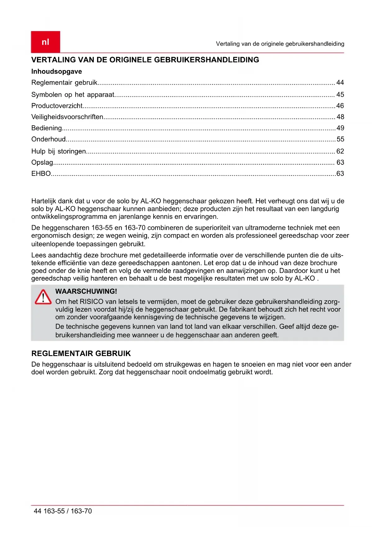 - EHBO Hartelijk dank dat u voor de solo by AL-KO heggenschaar gekozen heeft. Het verheugt ons dat wij u de solo by AL-KO heggenschaar kunnen aanbieden; deze producten zijn het resultaat van een langdurig ontwikkelingsprogramma en jarenlange kennis en ervaringen. De heggenscharen 163-55 en 163-70 combineren de superioriteit van ultramoderne techniek met een ergonomisch design; ze wegen weinig, zijn compact en worden als professioneel gereedschap voor zeer uiteenlopende toepassingen gebruikt. Lees aandachtig deze brochure met gedetailleerde informatie over de verschillende punten die de uits- tekende efficiëntie van deze gereedschappen aantonen. Let erop dat u de inhoud van deze brochure goed onder de knie heeft en volg de vermelde raadgevingen en aanwijzingen op. Daardoor kunt u het gereedschap veilig hanteren en behaalt u de best mogelijke resultaten met uw solo by AL-KO . WAARSCHUWING! Om het RISICO van letsels te vermijden, moet de gebruiker deze gebruikershandleiding zorg- vuldig lezen voordat hij/zij de heggenschaar gebruikt. De fabrikant behoudt zich het recht voor om zonder voorafgaande kennisgeving de technische gegevens te wijzigen. De technische gegevens kunnen van land tot land van elkaar verschillen. Geef altijd deze ge- bruikershandleiding mee wanneer u de heggenschaar aan anderen geeft. REGLEMENTAIR GEBRUIK De heggenschaar is uitsluitend bedoeld om struikgewas en hagen te snoeien en mag niet voor een ander doel worden gebruikt. Zorg dat heggenschaar nooit ondoelmatig gebruikt wordt.Symbolen op het apparaat 441662_b 45 p. 63