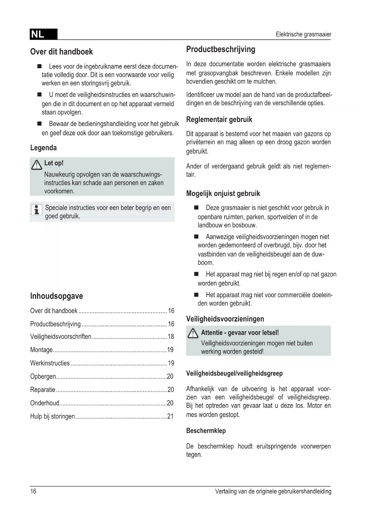 - Hulp bij storingen Over dit handboek Lees voor de ingebruikname eerst deze documen- tatie volledig door. Dit is een voorwaarde voor veilig werken en een storingsvrij gebruik. U moet de veiligheidsinstructies en waarschuwin- gen die in dit document en op het apparaat vermeld staan opvolgen. Bewaar de bedieningshandleiding voor het gebruik en geef deze ook door aan toekomstige gebruikers. Legenda Let op! Nauwkeurig opvolgen van de waarschuwings- instructies kan schade aan personen en zaken voorkomen. Speciale instructies voor een beter begrip en een goed gebruik. Productbeschrijving In deze documentatie worden elektrische grasmaaiers met grasopvangbak beschreven. Enkele modellen zijn bovendien geschikt om te mulchen. Identiceeruwmodelaandehandvandeproductafbeel- dingen en de beschrijving van de verschillende opties. Reglementair gebruik Dit apparaat is bestemd voor het maaien van gazons op privéterrein en mag alleen op een droog gazon worden gebruikt. Ander of verdergaand gebruik geldt als niet reglemen- tair. Mogelijk onjuist gebruik Deze grasmaaier is niet geschikt voor gebruik in openbare ruimten, parken, sportvelden of in de landbouw en bosbouw. Aanwezige veiligheidsvoorzieningen mogen niet worden gedemonteerd of overbrugd, bijv. door het vastbinden van de veiligheidsbeugel aan de duw- boom. Het apparaat mag niet bij regen en/of op nat gazon worden gebruikt. Het apparaat mag niet voor commerciële doelein- den worden gebruikt. Veiligheidsvoorzieningen Attentie - gevaar voor letsel! Veiligheidsvoorzieningen mogen niet buiten werking worden gesteld! Veiligheidsbeugel/veiligheidsgreep Afhankelijk van de uitvoering is het apparaat voor- zien van een veiligheidsbeugel of veiligheidsgreep. Bij het optreden van gevaar laat u deze los. Motor en mes worden gestopt. Beschermklep De beschermklep houdt eruitspringende voorwerpen tegen.NL p. 21