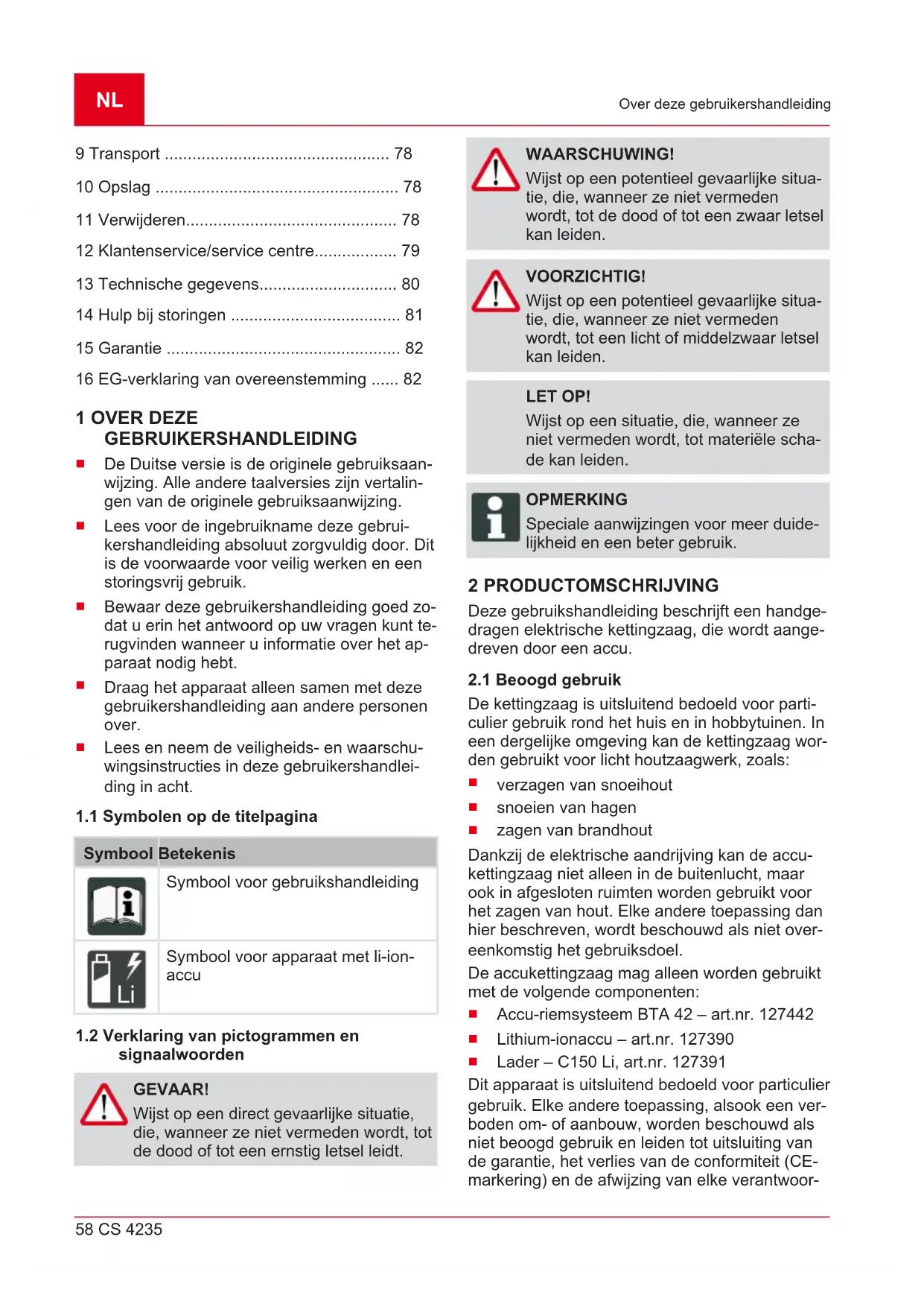 Schakel het apparaat uit en trek de stekker los! Storing Oorzaak Oplossing Motor draait niet. Geen accuspanning aanwe- zig. De stroomvoorziening laten controleren door een deskundig elektrotechnicus. Overlastbeveiliging heeft uit- geschakeld. Wacht tot de overlastbeveiliging de voeding weer inschakelt. Kettingrem geactiveerd. Geef de kettingrem vrij. Het zaagblad en de zaagket- ting draaien warm. Rookont- wikkeling. De zaagketting is te strak ge- spannen. Kettingspanning verlagen. De olietank is leeg. Vul kettingzaagolie bij. Het oliereservoir controleren op be- schadiging. De olietoevoeropening en/of de groef in het zaagblad zijn/ is vervuild. Reinig de olietoevoeropening en de groef in het zaagblad. De motor draait, maar de zaagketting beweegt niet. De zaagketting is te strak ge- spannen. Kettingspanning verlagen. Storing in het apparaat Bezoek een AL-KO service centre. In plaats van spanen wordt al- leen nog zaagsel uitgestoten. De kettingzaag moet door het hout worden geduwd. De zaagketting is stomp. Slijp de zaagketting of bezoek een AL-KO servicepunt. Apparaat trilt meer dan nor- maal. Storing in het apparaat Bezoek een AL-KO service centre.NL 82 CS 4235 Garantie OPMERKING Neem contact op met onze klantenservice bij storingen die niet in deze tabel staan vermeld of die u niet zelf kunt oplossen. 15 GARANTIE Eventueel binnen de wettelijke termijn voor aansprakelijkheid optredende materiaal- of fabricagefouten van het apparaat worden naar eigen oordeel door ons verholpen, hetzij door reparatie of door levering van een vervangend apparaat. De geldende termijn voor aansprakelijkheid hangt in elk geval af van de wetgeving in het land waarin het apparaat werd aangeschaft. Onze garantie geldt alleen bij:
