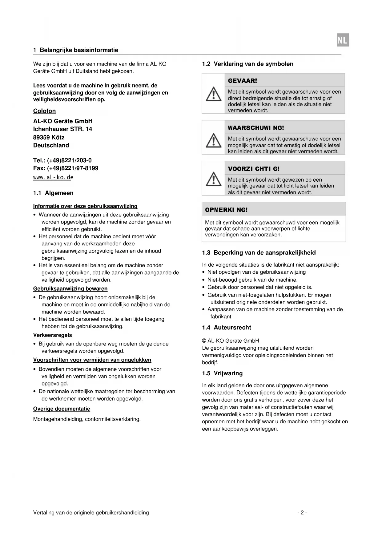 We zich bijd dat u voor een machine van de firma AL-KO Geräte GmbH uit Duitsland hebt gekozen.