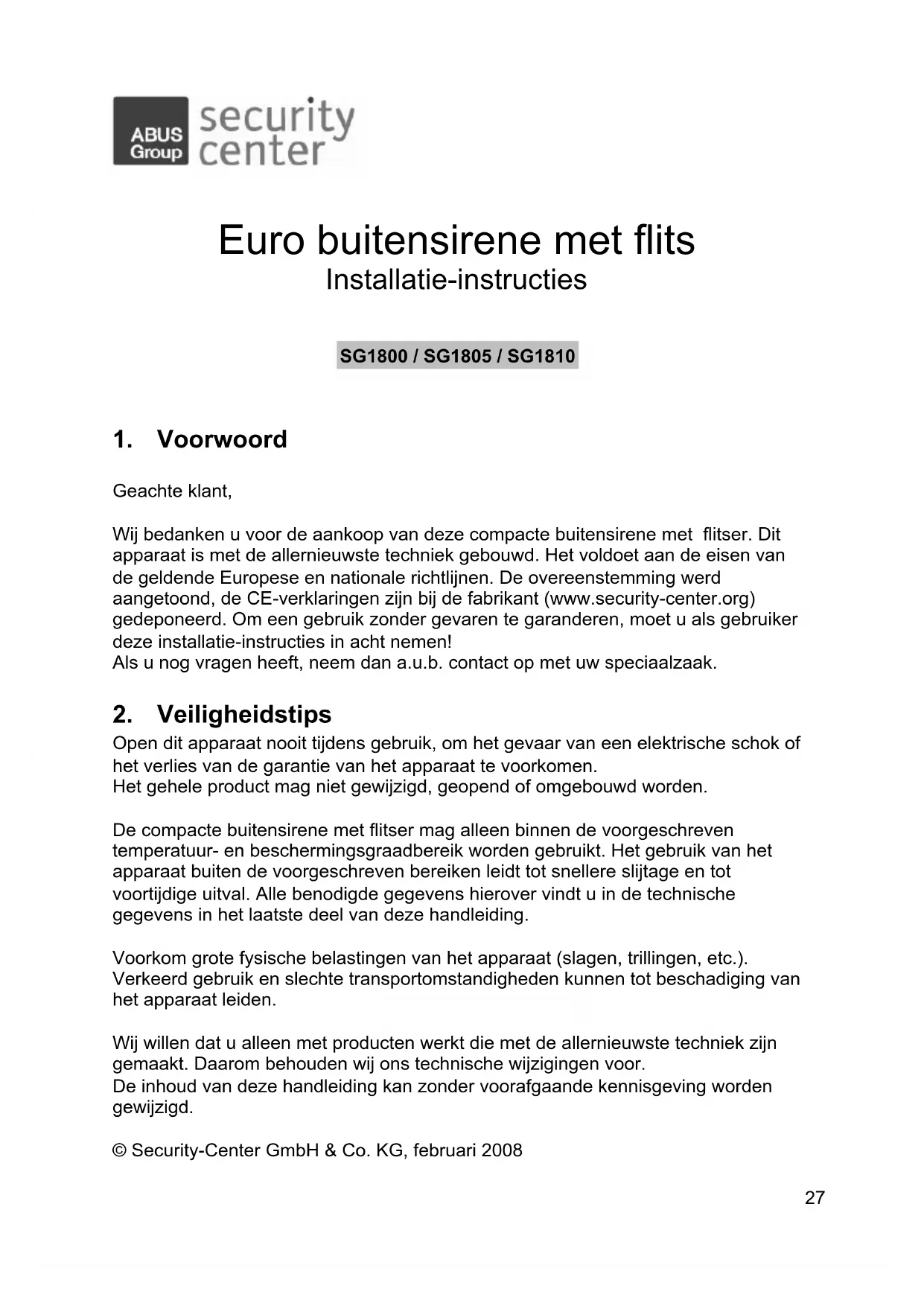 Open dit apparaat nooit tijdens gebruik, om het gevaar van een elektrische schok of het verlies van de garantie van het apparaat te voorkomen. Het gehele product mag niet gewijzigd, geopend of omgebouwd worden. De compacte buitensirene met flitser mag alleen binnen de voorgeschreven temperatuur- en beschermingsgraadbereik worden gebruikt. Het gebruik van het apparaat buiten de voorgeschreven bereiken leidt tot snellere slijtage en tot voortijdige uitval. Alle benodigde gegevens hierover vindt u in de technische gegevens in het laatste deel van deze handleiding. Voorkom grote fysische belastingen van het apparaat (slagen, trillingen, etc.). Verkeerd gebruik en slechte transportomstandigheden kunnen tot beschadiging van het apparaat leiden. Wij willen dat u alleen met producten werkt die met de allernieuwste techniek zijn gemaakt. Daarom behouden wij ons technische wijzigingen voor. De inhoud van deze handleiding kan zonder voorafgaande kennisgeving worden gewijzigd. © Security-Center GmbH & Co. KG, februari 2008 Euro buitensirene met flits Installatie-instructies SG1800 / SG1805 / SG181028