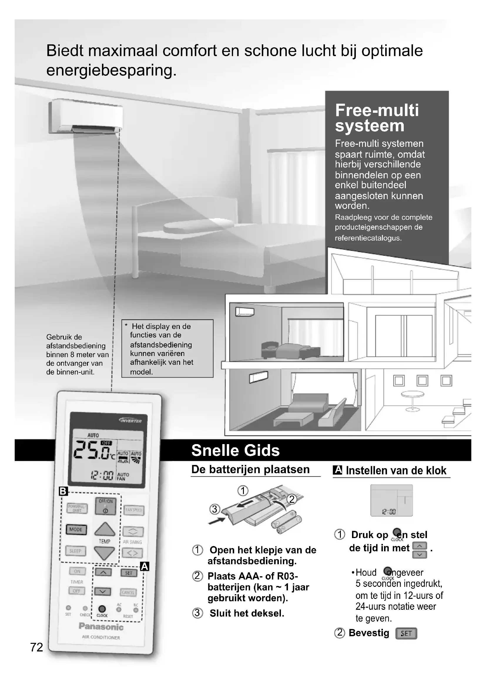 Per alcuni errori è possibile riavviare l’unità con una operazione limitata se vi sono 4 bip durante l’avvio. Soluzione dei problemi ACXF55-04100_05IT.indd 71ACXF55-04100_05IT.indd 71 12/19/2016 5:30:57 PM12/19/2016 5:30:57 PM72 Free-multi systeem Free-multi systemen spaart ruimte, omdat hierbij verschillende binnendelen op een enkel buitendeel aangesloten kunnen worden. Raadpleeg voor de complete producteigenschappen de referentiecatalogus. Biedt maximaal comfort en schone lucht bij optimale energiebesparing. Gebruik de afstandsbediening binnen 8 meter van de ontvanger van de binnen-unit. Snelle Gids De batterijen plaatsen