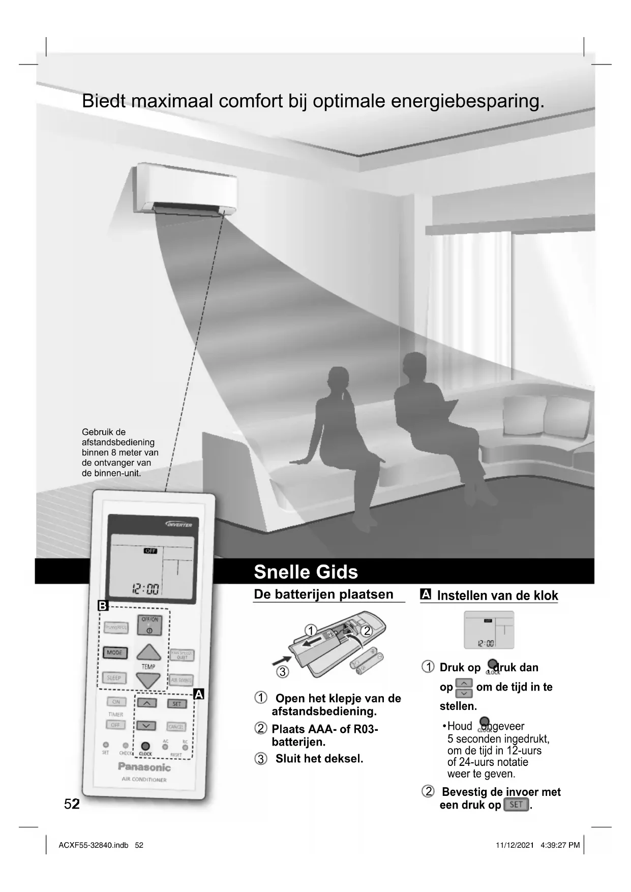 - De werking van de timer volgt de instelling van de klok op de afstandsbediening en wordt dagelijks herhaald als de timer is ingesteld. Zie de beknopte handleiding voor het instellen van de klok. De timer kan zo worden ingesteld dat op 2 verschillende vooraf ingestelde tijden de unit aan- en uitgezet wordt. Het gebruik ACXF55-32840.indb 55ACXF55-32840.indb 55 11/12/2021 4:39:29 PM11/12/2021 4:39:29 PM56 Meer weten... Bedieningsstand AUTO : Het POWER-lampje gaat in de beginfase knipperen. De unit kiest elke 10 minuten een bedrijfsstand, afhankelijk van de instelling en de ruimtetemperatuur. VERWARMEN : Het POWER-lampje gaat in de beginfase knipperen. De unit heeft enige tijd nodig om op te warmen.