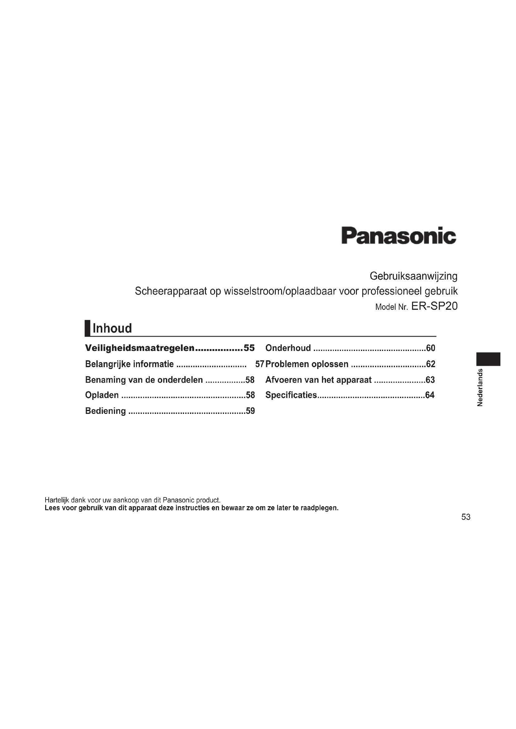 - Bescherming van het milieu en hergebruik van materialen Dit apparaat is voorzien van een lithium‑ionbatterij. Lever de accu in op een speciaal daarvoor bestemd verzamelpunt bij u in de buurt.64 Nederlands Specicaties Voedingsbron Zie het naamplaatje op de wisselstroomadapter. (automatische spanningsomzetting) Motorspanning 3,6 V Oplaadtijd Ongeveer 1 uur Voor meer informatie over de energie-efciëntie van het product kunt u op onze website, www.panasonic.com, het modelnummer in het zoekvenster typen. Het ontdoen van oude apparatuur en batterijen Enkel voordeEuropeseUnieenlandenmetrecyclesystemen Deze symbolen op de producten, verpakkingen en/of begeleidende documenten betekenen dat gebruikte elektrische en elektronische producten en batterijen niet samen mogen worden weggegooid met de rest van het huishoudelijk afval. Voor een juiste verwerking, hergebruik en recycling van oude producten en batterijen, gelieve deze in te leveren bij de desbetreffende inleverpunten in overeenstemming met uw nationale wetgeving. Door ze op de juiste wijze weg te gooien, helpt u mee met het besparen van kostbare hulpbronnen en voorkomt u potentiële negatieve effecten op de volksgezondheid en het milieu. Voor meer informatie over inzameling en recycling kunt u contact opnemen met uw plaatselijke gemeente. Afhankelijk van uw nationale wetgeving kunnen er boetes worden opgelegd bij het onjuist weggooien van dit soort afval. Letop:hetbatterijsymbool(Onderstaandsymbool) Dit symbool kan in combinatie met een chemisch symbool gebruikt worden. In dit geval volstaan de eisen, die zijn vastgesteld in de richtlijnen van de desbetreffende chemische stof. Importeur: Panasonic Marketing Europe GmbH Bevoegde vertegenwoordiger in de EU: Panasonic Testing Centre Winsbergring 15, 22525 Hamburg, Duitsland Geproduceerd door: Panasonic Corporation 1006, Oaza Kadoma, Kadoma‑stad, Osaka, Japan65 Español Instrucciones de funcionamiento Afeitadora recargable para uso profesional Modelo n.º ER‑SP20 Gracias por comprar este producto Panasonic. Antesdeponerestaunidadenfuncionamiento,lealasinstruccionesensutotalidadyguárdelasparasuusoenelfuturo. Precauciones de seguridad p. 67