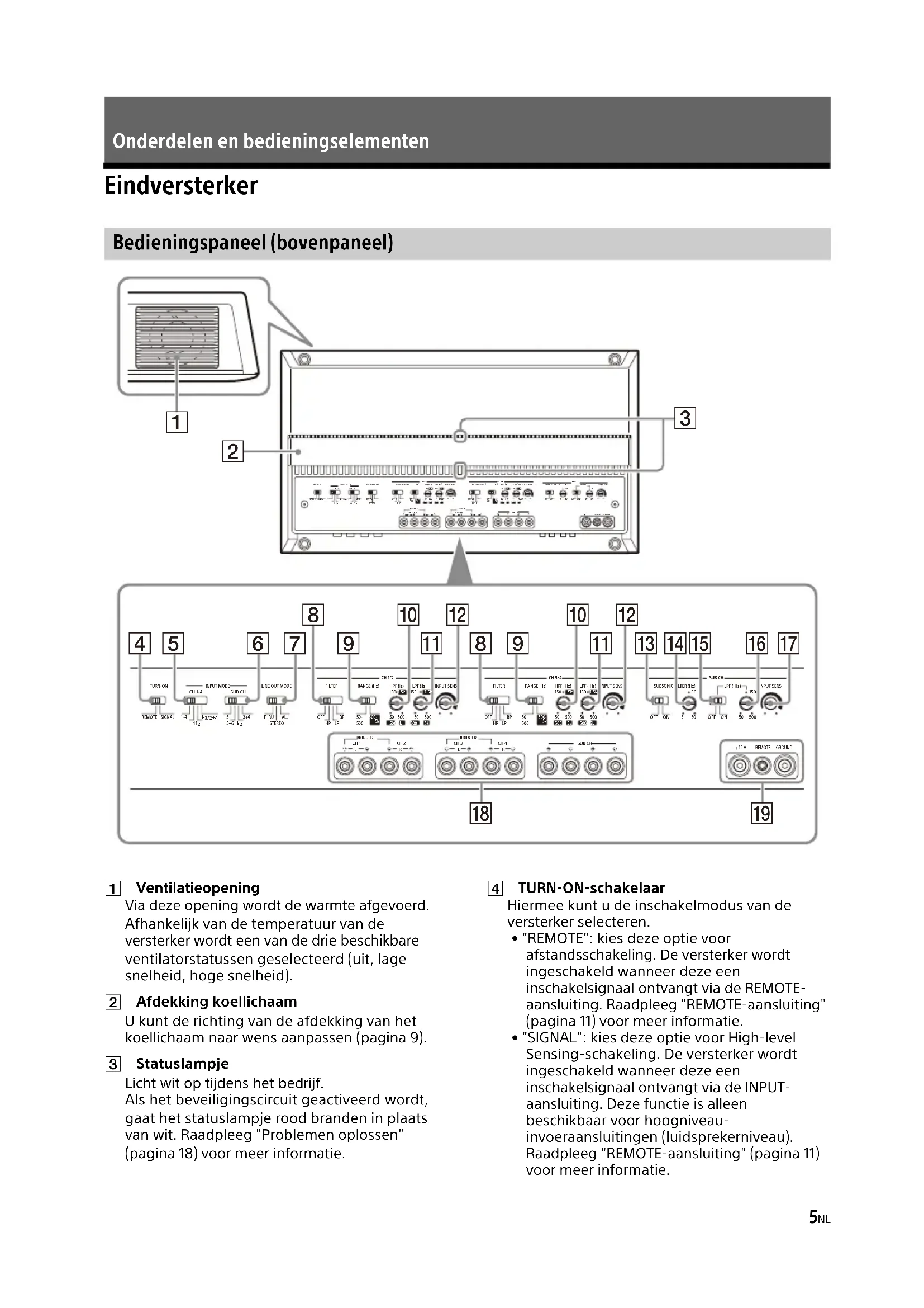 - Ondersteuningssite NL Eindversterker Ventilatieopening Via deze opening wordt de warmte afgevoerd. Afhankelijk van de temperatuur van de versterker wordt een van de drie beschikbare ventilatorstatussen geselecteerd (uit, lage snelheid, hoge snelheid). Afdekking koellichaam U kunt de richting van de afdekking van het koellichaam naar wens aanpassen (pagina 9). Statuslampje Licht wit op tijdens het bedrijf. Als het beveiligingscircuit geactiveerd wordt, gaat het statuslampje rood branden in plaats van wit. Raadpleeg "Problemen oplossen" (pagina 18) voor meer informatie. TURN-ON-schakelaar Hiermee kunt u de inschakelmodus van de versterker selecteren. p. 185