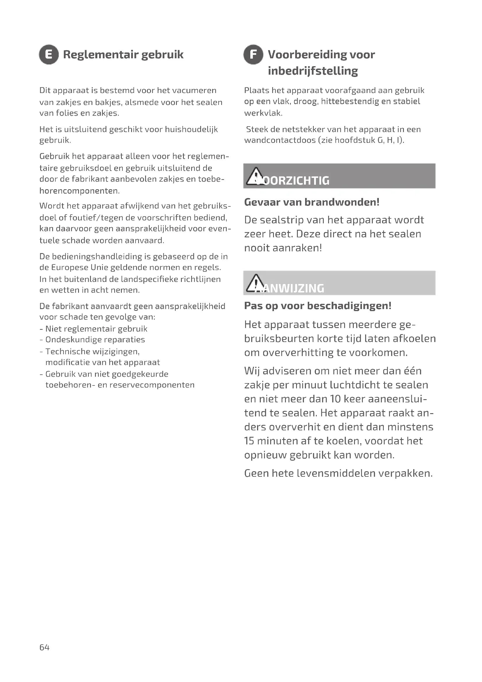 Reglementair gebruik Ditapparaatisbestemdvoorhetvacumeren vanzakjesenbakjes,alsmedevoorhetsealen vanfoliesenzakjes. Hetisuitsluitendgeschiktvoorhuishoudelijk gebruik. Gebruikhetapparaatalleenvoorhetreglemen- tairegebruiksdoelengebruikuitsluitendde doordefabrikantaanbevolenzakjesentoebe- horencomponenten. Wordthetapparaatafwijkendvanhetgebruiks- doeloffoutief/tegendevoorschriftenbediend, kandaarvoorgeenaansprakelijkheidvooreven- tueleschadewordenaanvaard. Debedieningshandleidingisgebaseerdopdein deEuropeseUniegeldendenormenenregels. Inhetbuitenlanddelandspeciekerichtlijnen enwetteninachtnemen. Defabrikantaanvaardtgeenaansprakelijkheid voorschadetengevolgevan: -Nietreglementairgebruik -Ondeskundigereparaties -Technischewijzigingen, modicatievanhetapparaat -Gebruikvannietgoedgekeurde toebehoren-enreservecomponenten Plaatshetapparaatvoorafgaandaangebruik opeenvlak,droog,hittebestendigenstabiel werkvlak. Steekdenetstekkervanhetapparaatineen wandcontactdoos(ziehoofdstukG,H,I). Pasopvoorbeschadigingen! Hetapparaattussenmeerderege- bruiksbeurtenkortetijdlatenafkoelen omoververhittingtevoorkomen. Wijadviserenomnietmeerdanéén zakjeperminuutluchtdichttesealen ennietmeerdan10keeraaneenslui- tendtesealen.Hetapparaatraaktan- dersoververhitendientdanminstens 15minutenaftekoelen,voordathet opnieuwgebruiktkanworden. Geenhetelevensmiddelenverpakken. Gevaarvanbrandwonden! Desealstripvanhetapparaatwordt zeerheet.Dezedirectnahetsealen nooitaanraken!