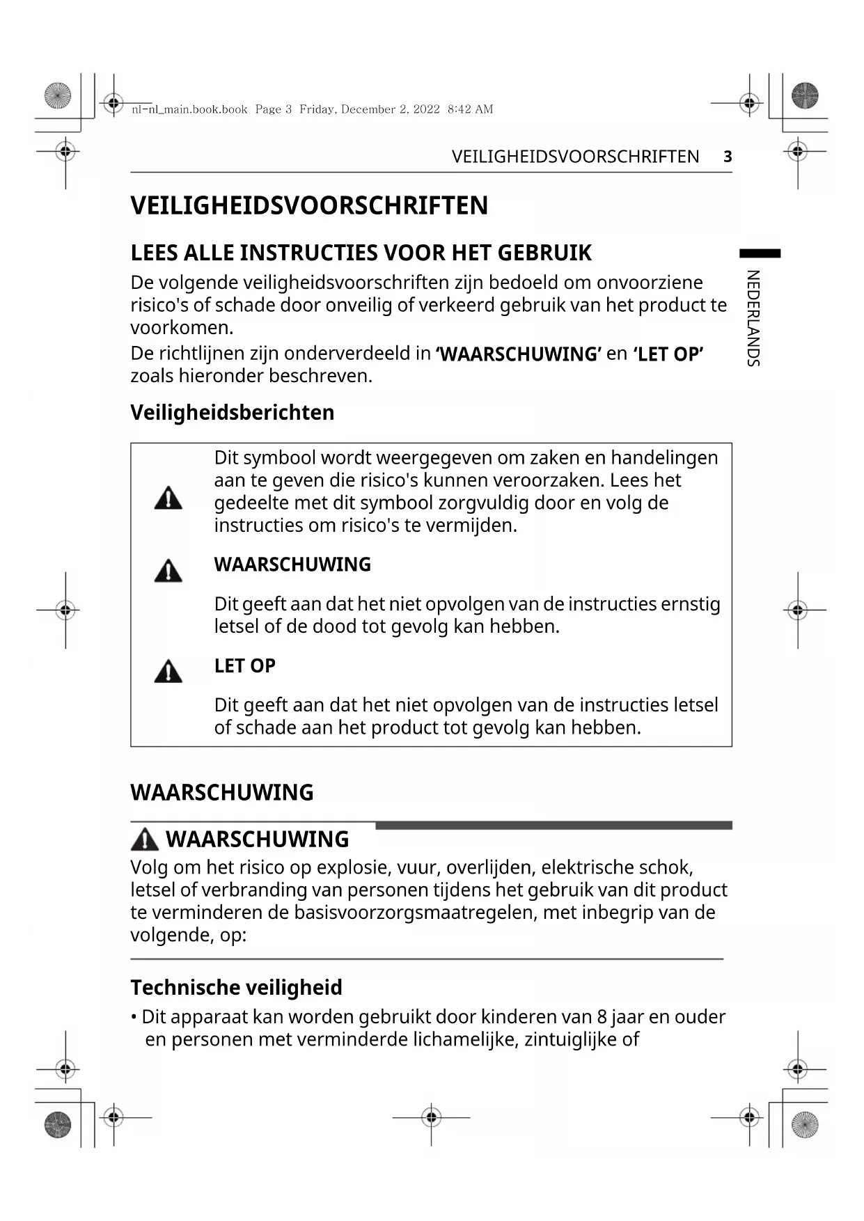 - Dit apparaat kan worden gebruikt door kinderen van 8 jaar en ouder en personen met verminderde lichamelijke, zintuiglijke of Dit symbool wordt weergegeven om zaken en handelingen aan te geven die risico's kunnen veroorzaken. Lees het gedeelte met dit symbool zorgvuldig door en volg de instructies om risico's te vermijden. WAARSCHUWING Dit geeft aan dat het niet opvolgen van de instructies ernstig letsel of de dood tot gevolg kan hebben. LET OP Dit geeft aan dat het niet opvolgen van de instructies letsel of schade aan het product tot gevolg kan hebben. nl-nl_main.book.book Page 3 Friday, December 2, 2022 8:42 AM4 VEILIGHEIDSVOORSCHRIFTEN verstandelijke vermogens of gebrek aan ervaring en kennis, als ze onder toezicht staan of worden geïnstrueerd over het veilig gebruik van het apparaat en bijbehorende gevaren begrijpen. Kinderen mogen niet met het apparaat spelen. Reiniging en onderhoud door de gebruiker mogen niet worden uitgevoerd door kinderen zonder toezicht.