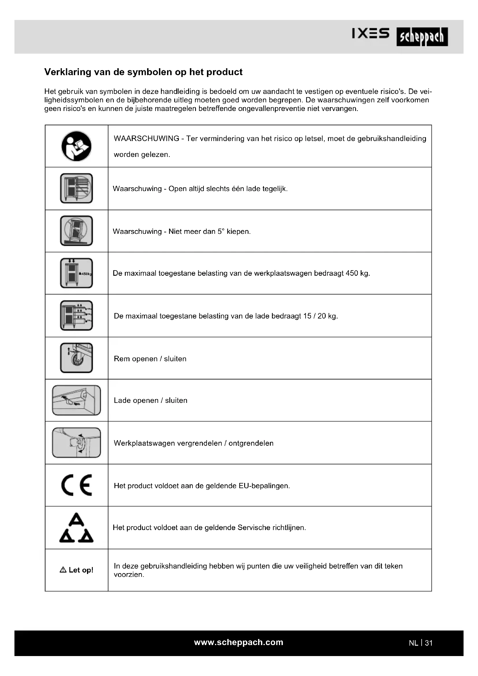 Verklaring van de symbolen op het product Het gebruik van symbolen in deze handleiding is bedoeld om uw aandacht te vestigen op eventuele risico's. De vei- ligheidssymbolen en de bijbehorende uitleg moeten goed worden begrepen. De waarschuwingen zelf voorkomen geen risico's en kunnen de juiste maatregelen betreende ongevallenpreventie niet vervangen. WAARSCHUWING - Ter vermindering van het risico op letsel, moet de gebruikshandleiding worden gelezen. Waarschuwing - Open altijd slechts één lade tegelijk. Waarschuwing - Niet meer dan 5° kiepen. 450kg De maximaal toegestane belasting van de werkplaatswagen bedraagt 450 kg. 15kg 20kg 20kg De maximaal toegestane belasting van de lade bedraagt 15 / 20 kg. Rem openen / sluiten Lade openen / sluiten Werkplaatswagen vergrendelen / ontgrendelen Het product voldoet aan de geldende EU-bepalingen. Het product voldoet aan de geldende Servische richtlijnen. m Let op! In deze gebruikshandleiding hebben wij punten die uw veiligheid betreen van dit teken voorzien.www.scheppach.com