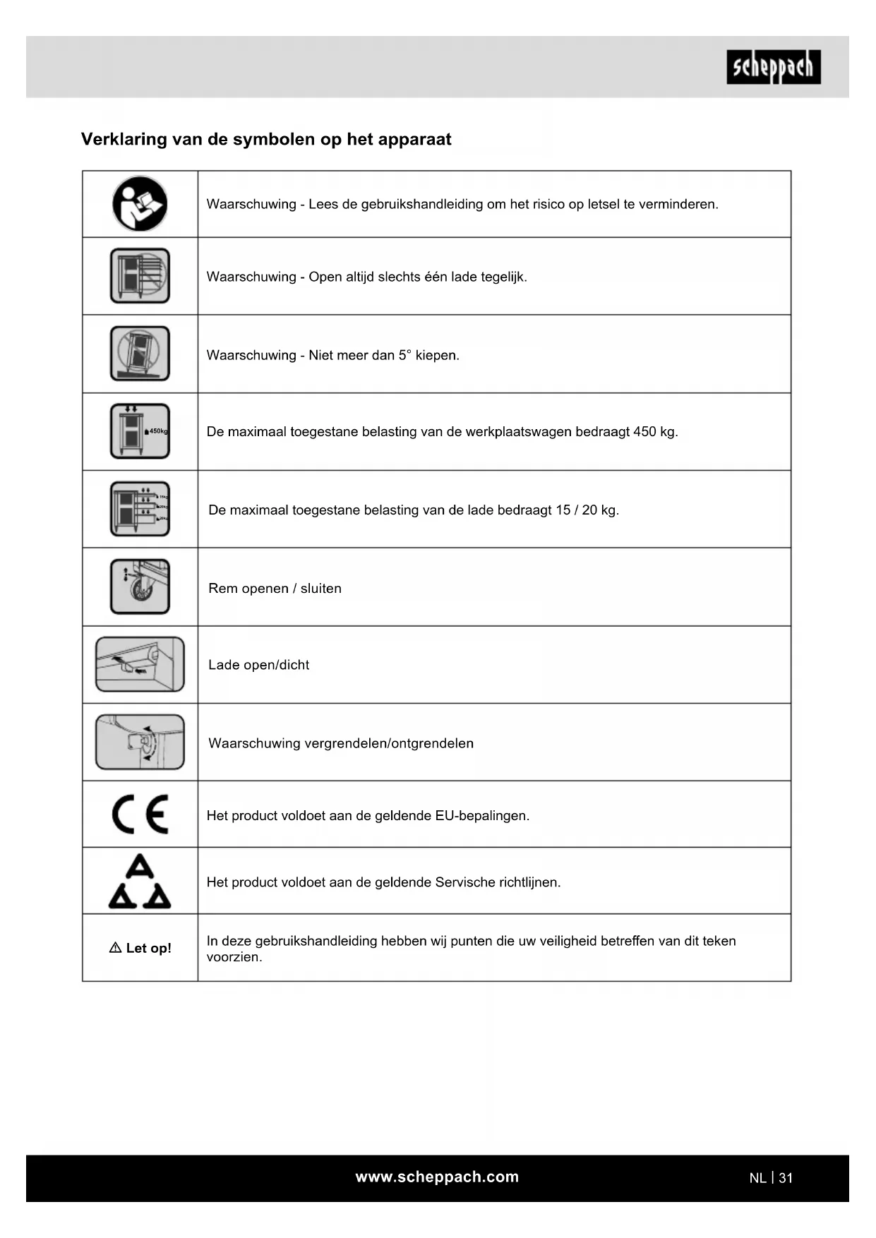Verklaring van de symbolen op het apparaat Waarschuwing - Lees de gebruikshandleiding om het risico op letsel te verminderen. Waarschuwing - Open altijd slechts één lade tegelijk. Waarschuwing - Niet meer dan 5° kiepen. 450kg De maximaal toegestane belasting van de werkplaatswagen bedraagt 450 kg. 15kg 20kg 20kg De maximaal toegestane belasting van de lade bedraagt 15 / 20 kg. Rem openen / sluiten Lade open/dicht Waarschuwing vergrendelen/ontgrendelen Het product voldoet aan de geldende EU-bepalingen. Het product voldoet aan de geldende Servische richtlijnen. m Let op! In deze gebruikshandleiding hebben wij punten die uw veiligheid betreen van dit teken voorzien.www.scheppach.com